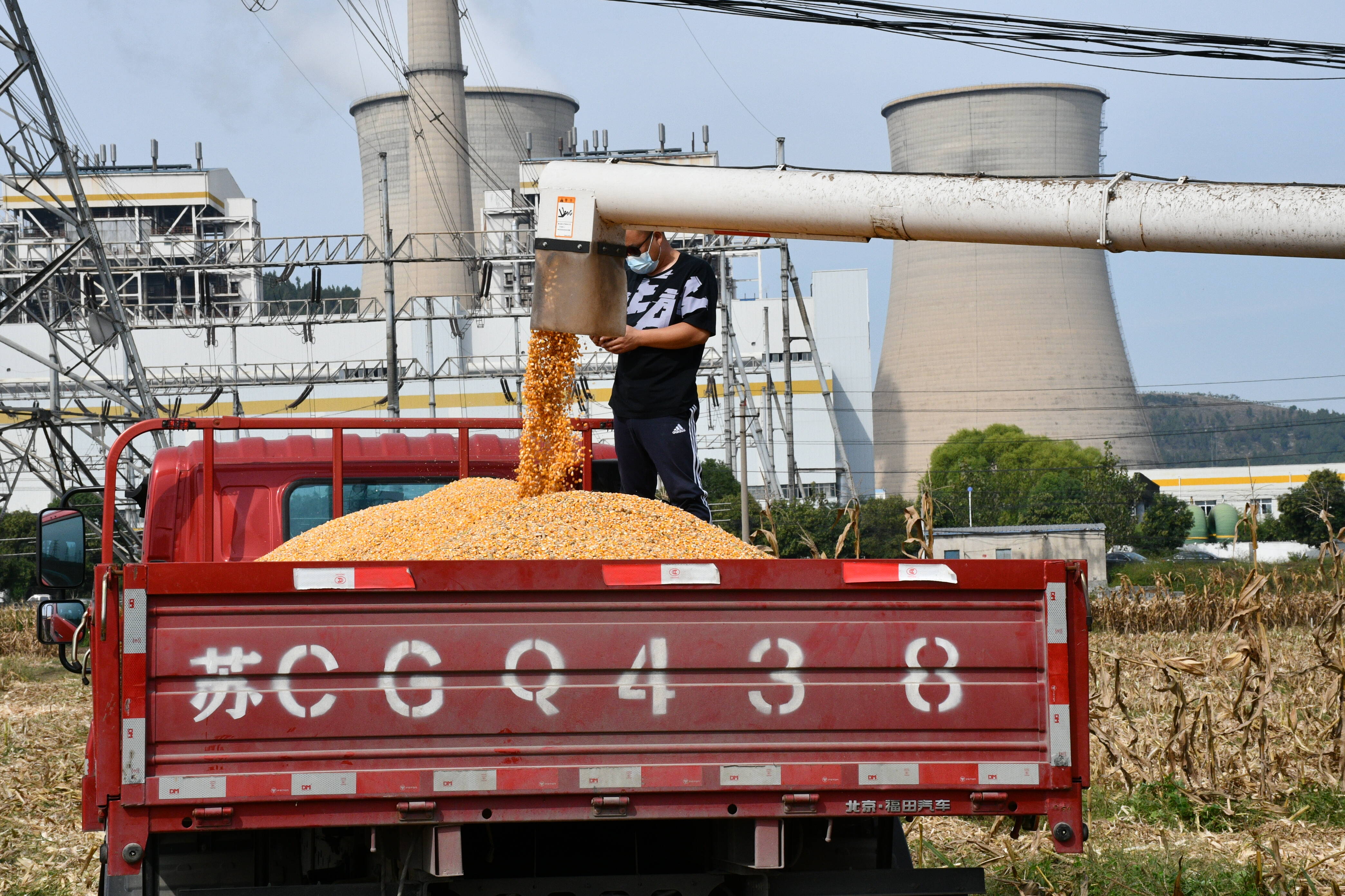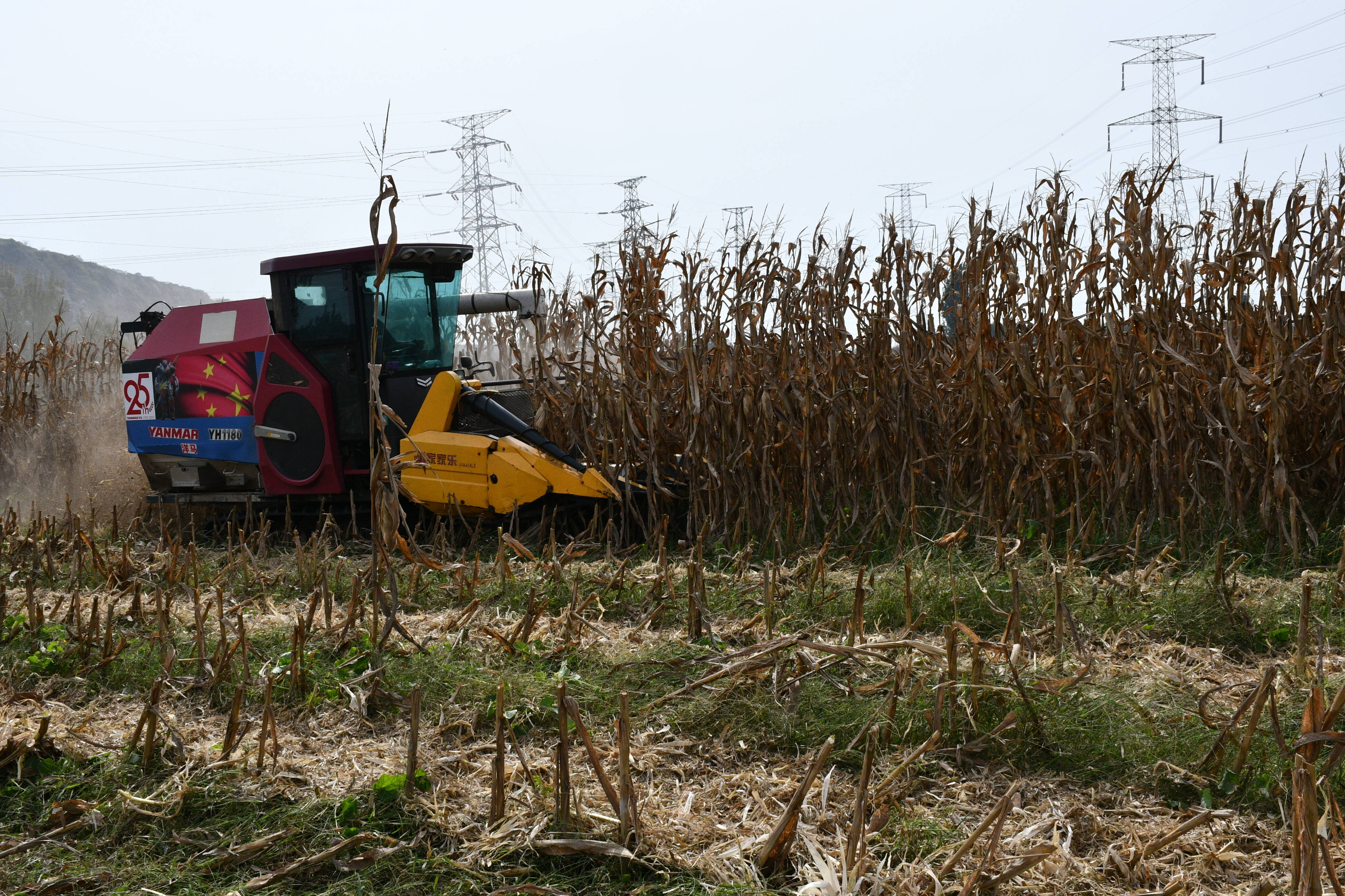 图为,茅村镇檀山村农民在机械化收割玉米。
