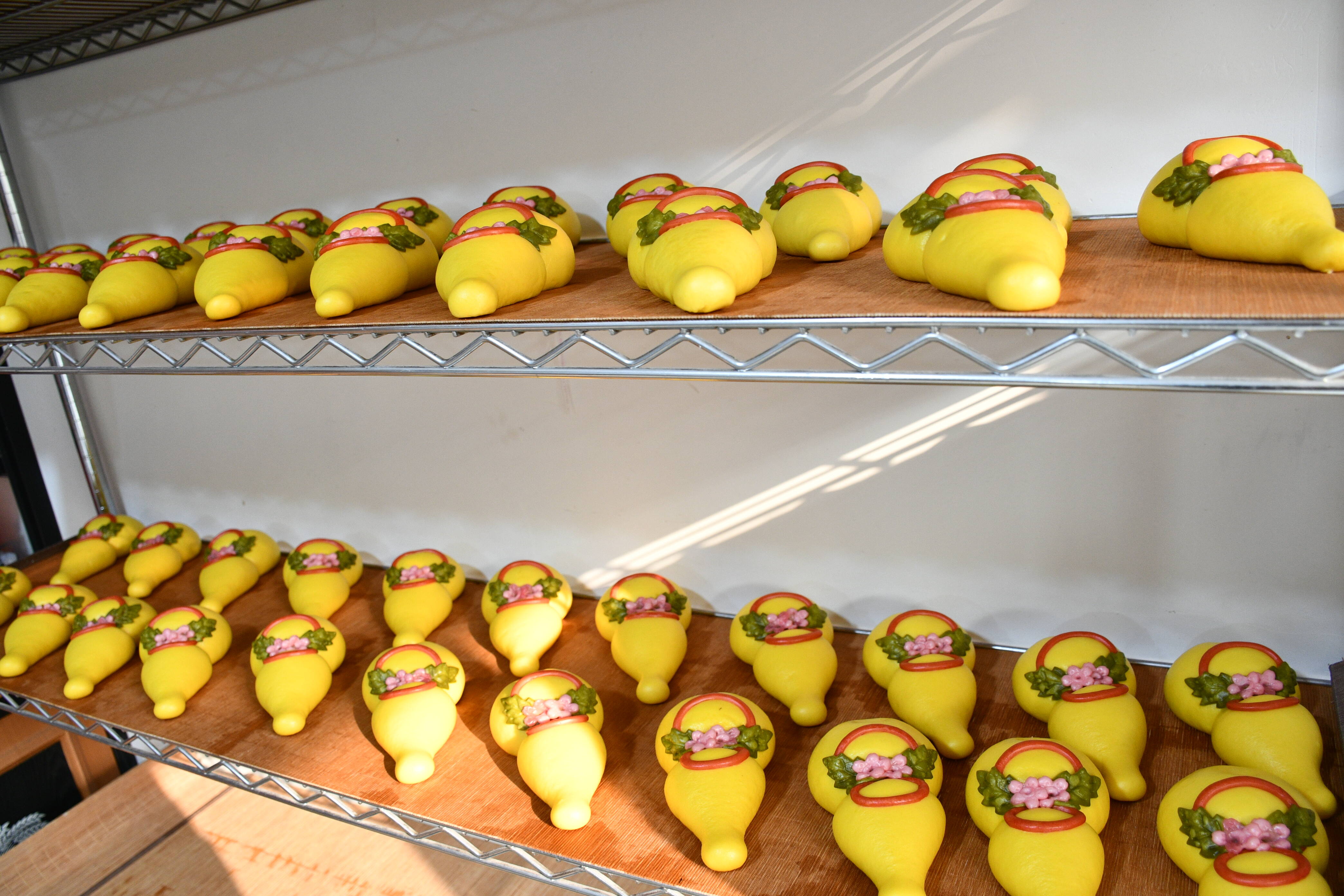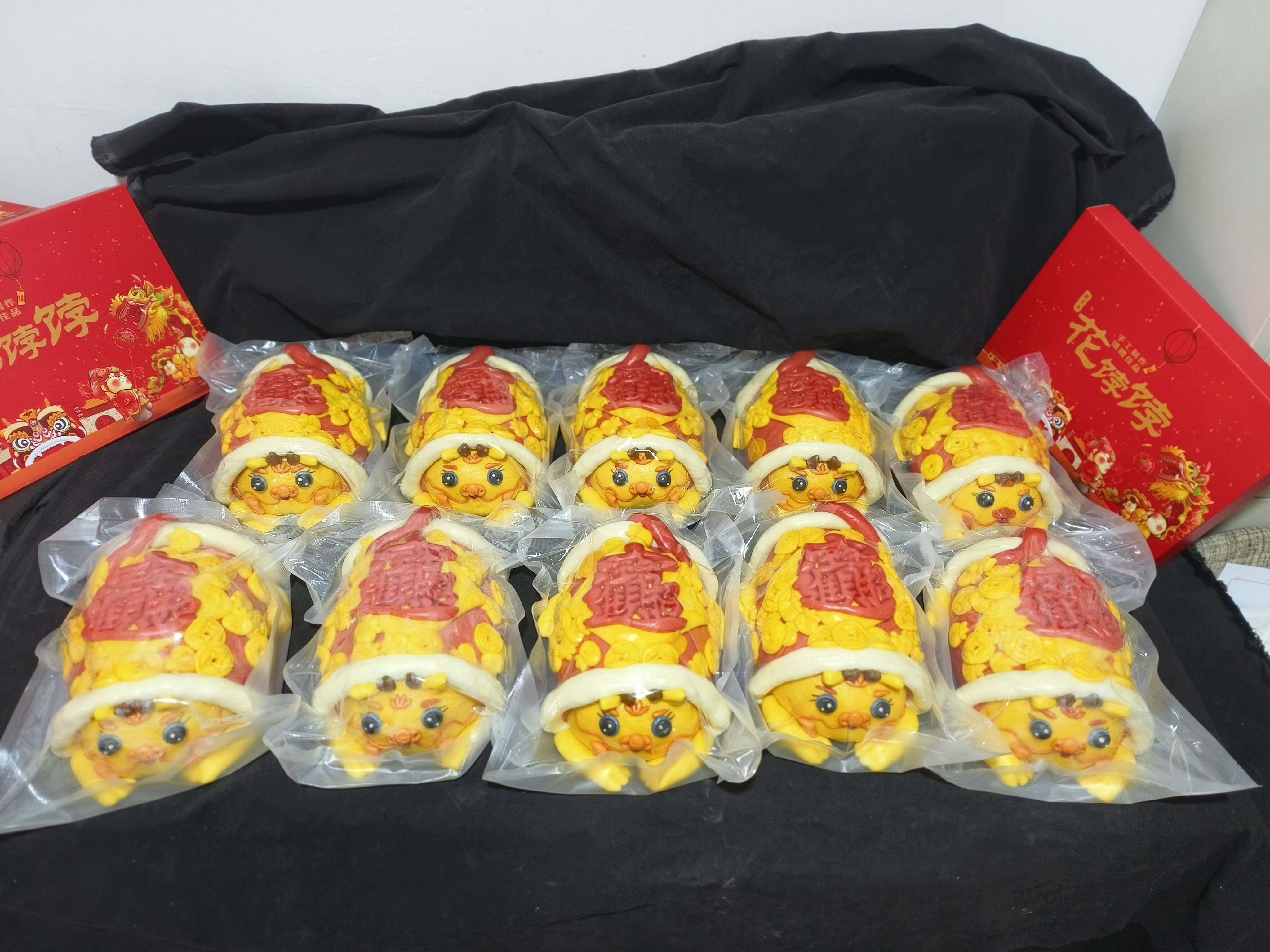 口含龙珠,瞪大眼睛笑逐颜开,黄色的身体、红色的龙鳍、精壮的爪,矫健的身体、强有力的尾巴,如同驾云而来,这只形态逼真的翔龙,成为铜山区茅村镇谷飘花饽饽店里龙年最畅销的花饽饽品种之一。