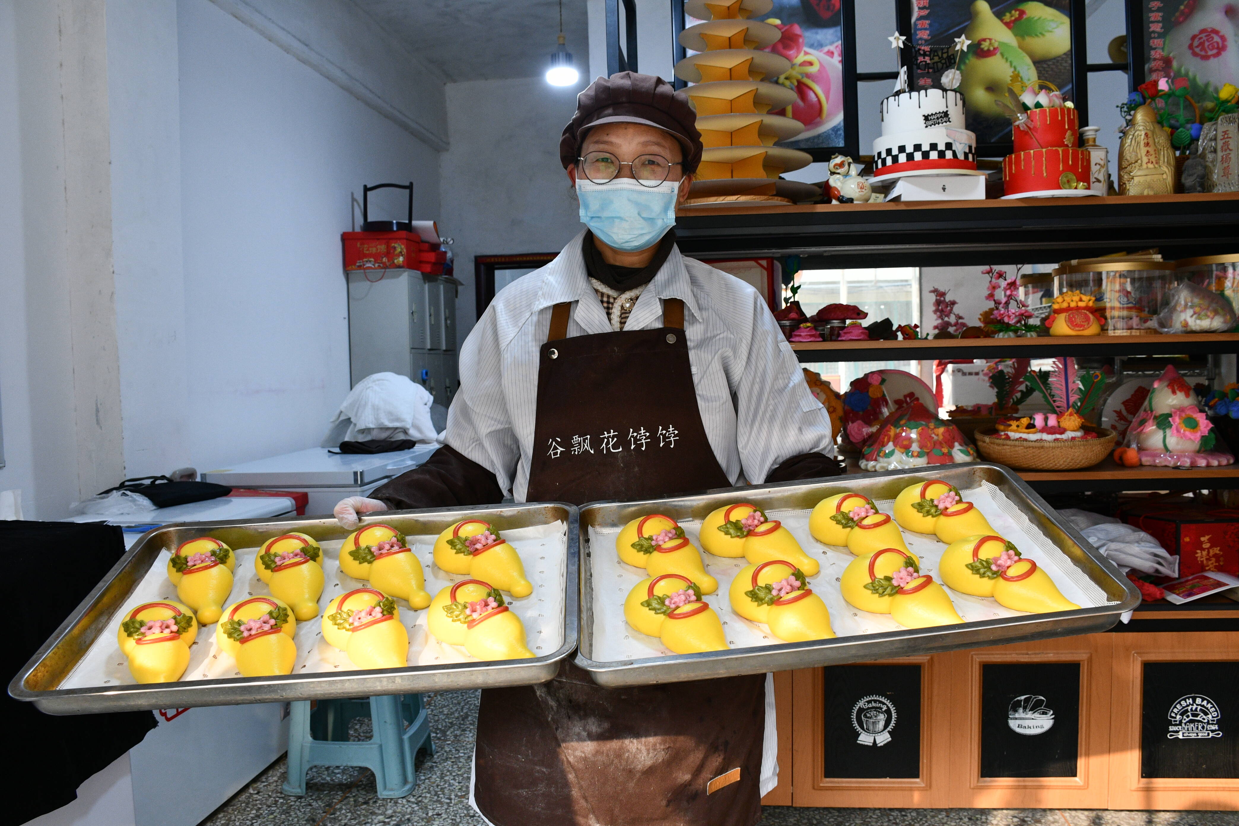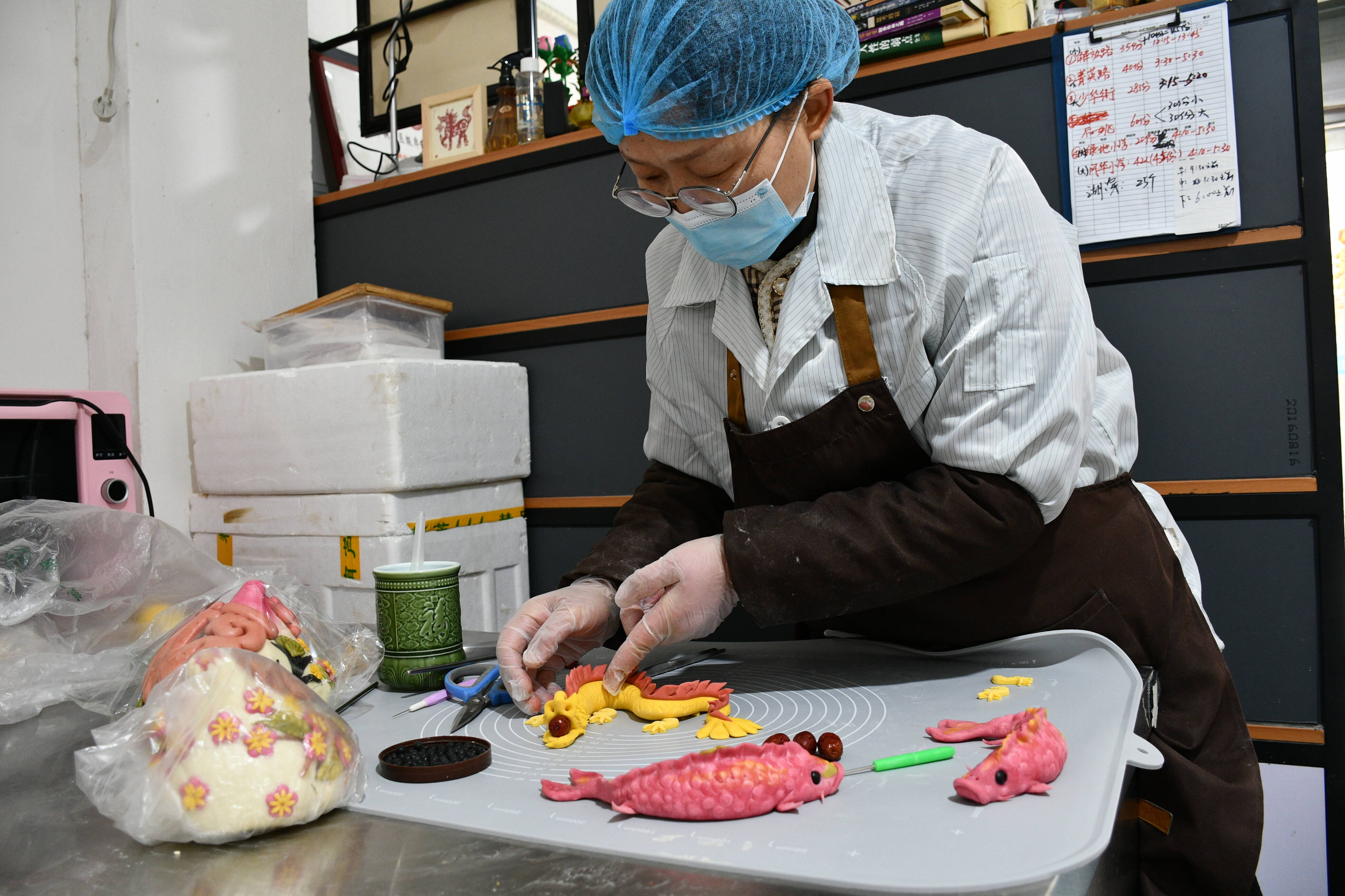 春节临近,谷飘花饽饽店的老板刘岩岩可忙坏了,每天忙着接订单、做花饽饽,有时忙到通宵。她做的花饽饽采用传统手工制作,其中的五颜六色都取自纯天然的果蔬汁,受到很多顾客的喜爱。在她店里,摆满了各式各样大约20多种类型的花饽饽,煞是喜人,金龙贺春、元宝、醒狮、寿桃、福袋、苹果、葫芦、鲤鱼等,一个个制作精美、漂亮的花饽饽使人赏心悦目。不同形状、不同花样的花饽饽,也可以拼凑成寓意深远的中式蛋糕,表达了人们对美好生活的憧憬和向往。