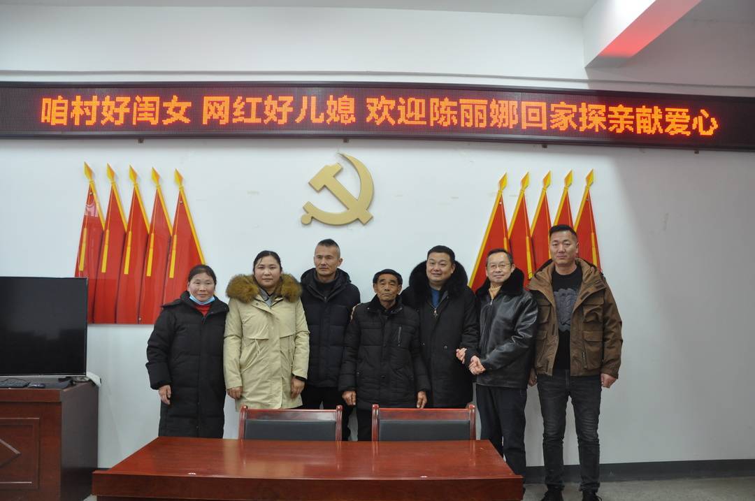 上午10点20分,一辆货拉拉驰进三座楼村委会大院,陈丽娜和随行人员将82份过节慰问礼品卸下,每份礼物中有一桶食用油、一箱牛奶,还有萨琪玛和手撕面包,都是老人喜爱的食品。村里会议室电子屏幕上,打出“咱村好闺女 网红好儿媳 欢迎陈丽娜回家献爱心”的字幕。陈丽娜的二姐和姐夫也来到现场,大家回忆往事,聊聊家常。
