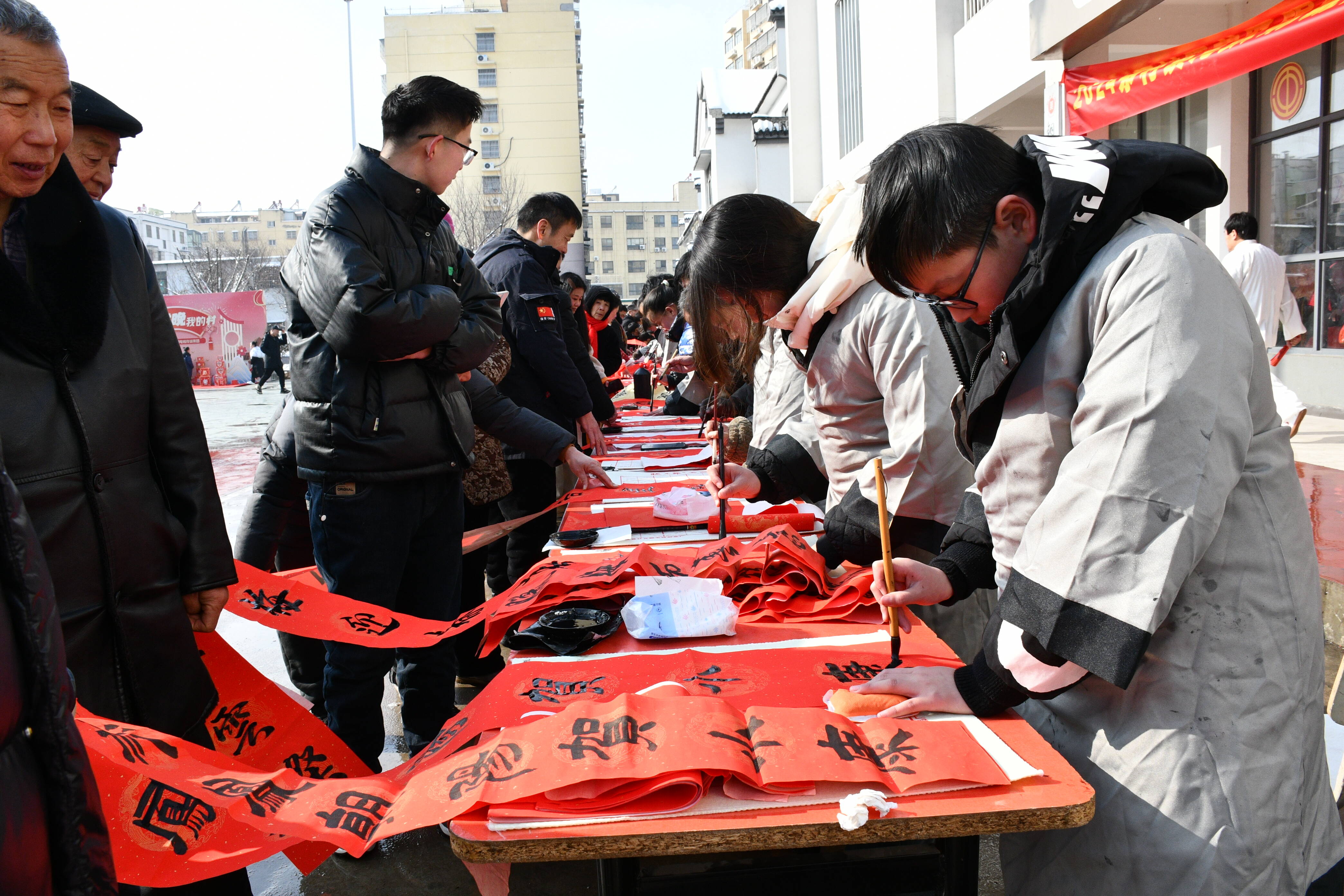 “无联不成春,有联春更浓。”当一副副喜庆的春联挂起来的时候,年的氛围就愈发浓厚。刚吃过午饭,茅村镇书法协会人员带着一群小书法爱好者在茅村镇新时代文明实践站开展写春联送“福气”活动。现场,一张张红纸铺陈开来,书法爱好者们神情专注,铺纸、蘸墨、挥毫自如,为大家写春联迎祥纳福。火红的春联、温暖的祝福,为即将到来的新年增添了喜气。