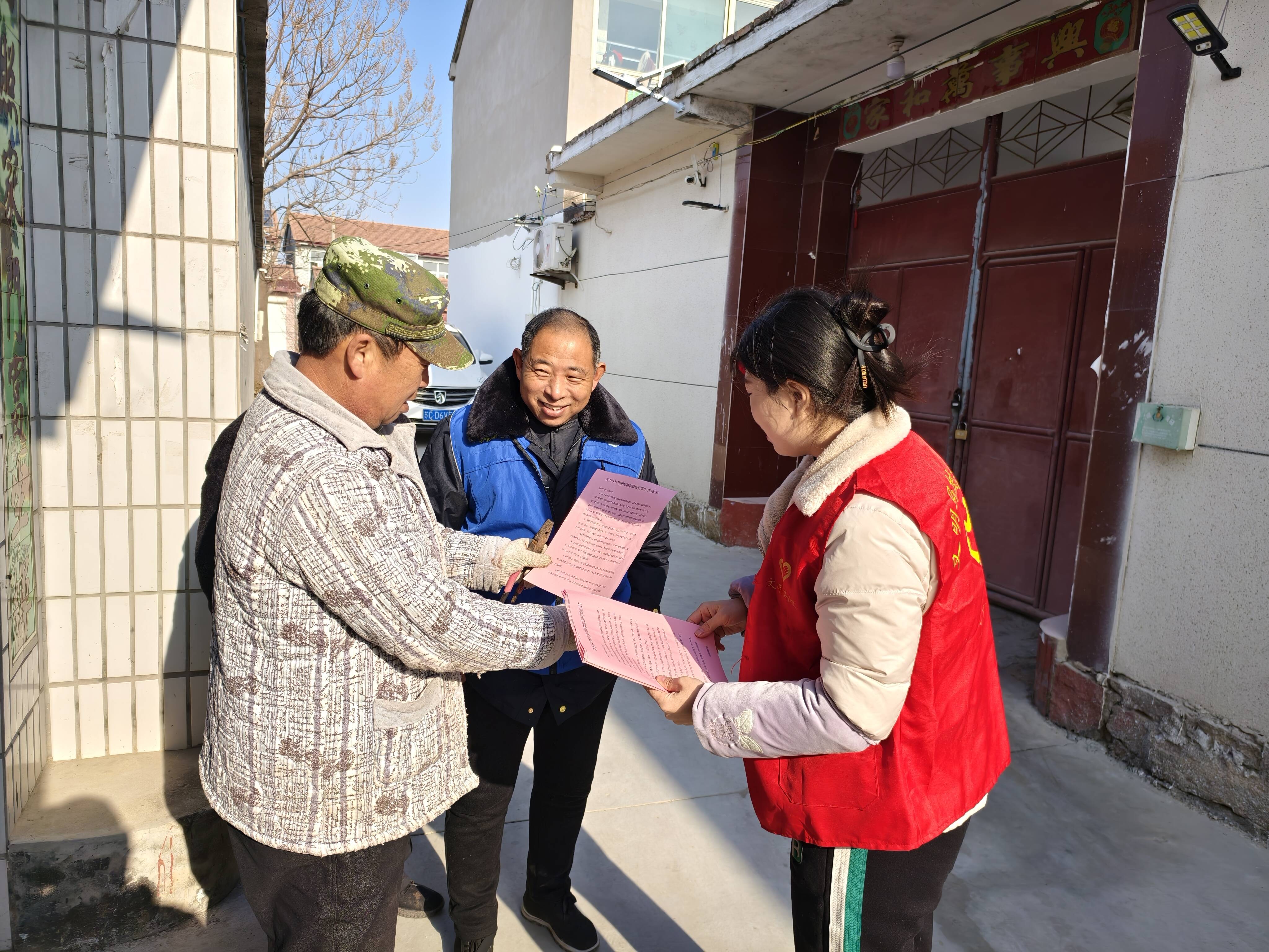 大新庄村志愿者向村民发放相关宣传材料,同时以“线上+线下”相结合的方式,利用小喇叭、村组微信群等方式,向村民普及燃放烟花爆竹的危害,倡议村民们从自我做起,共同做一个禁燃禁放烟花爆竹的践行者。