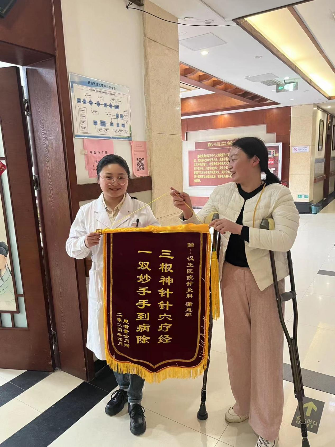 近日董女士为汉王镇中心医院蒲思琪和李柯宏医生献上锦旗。