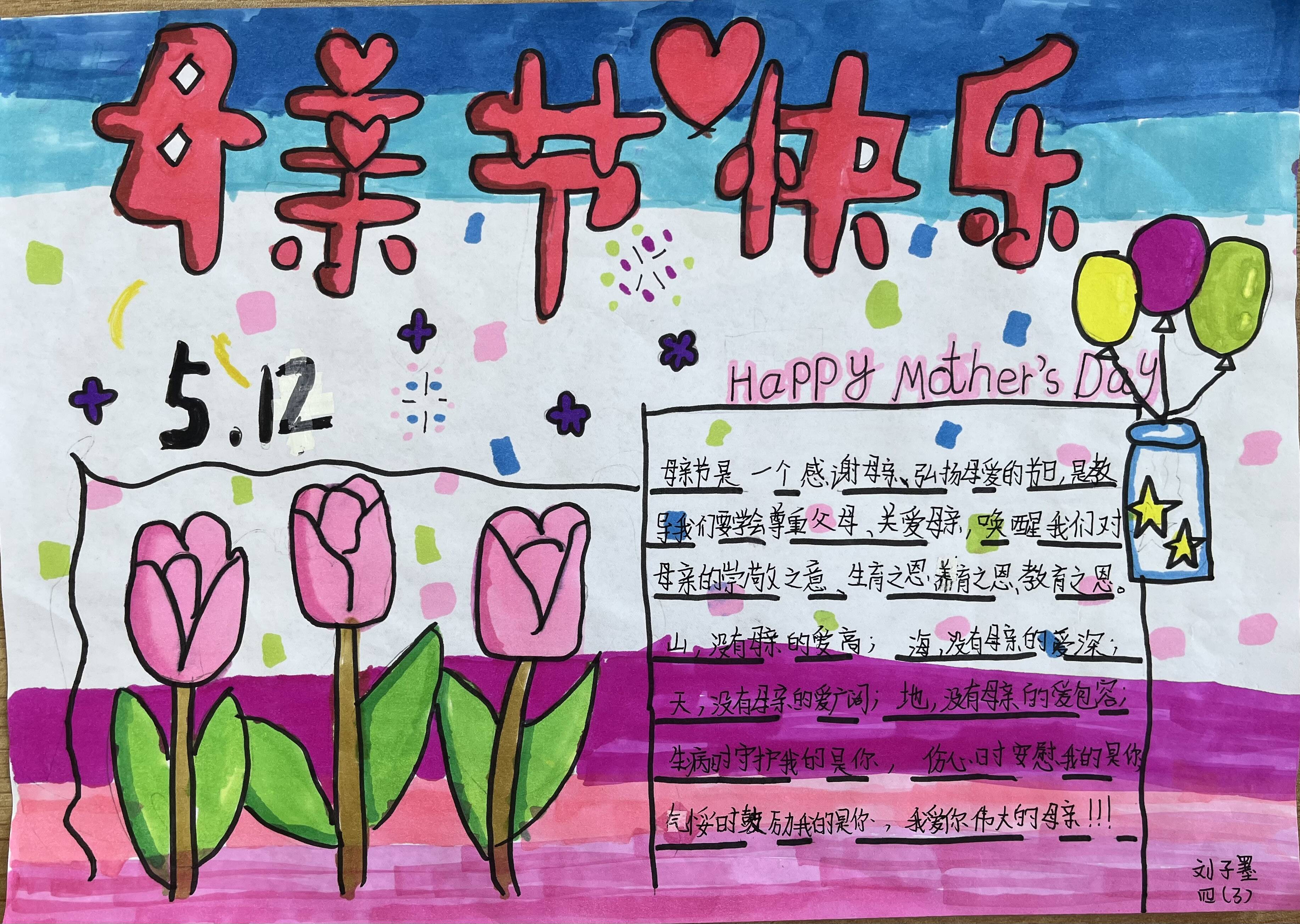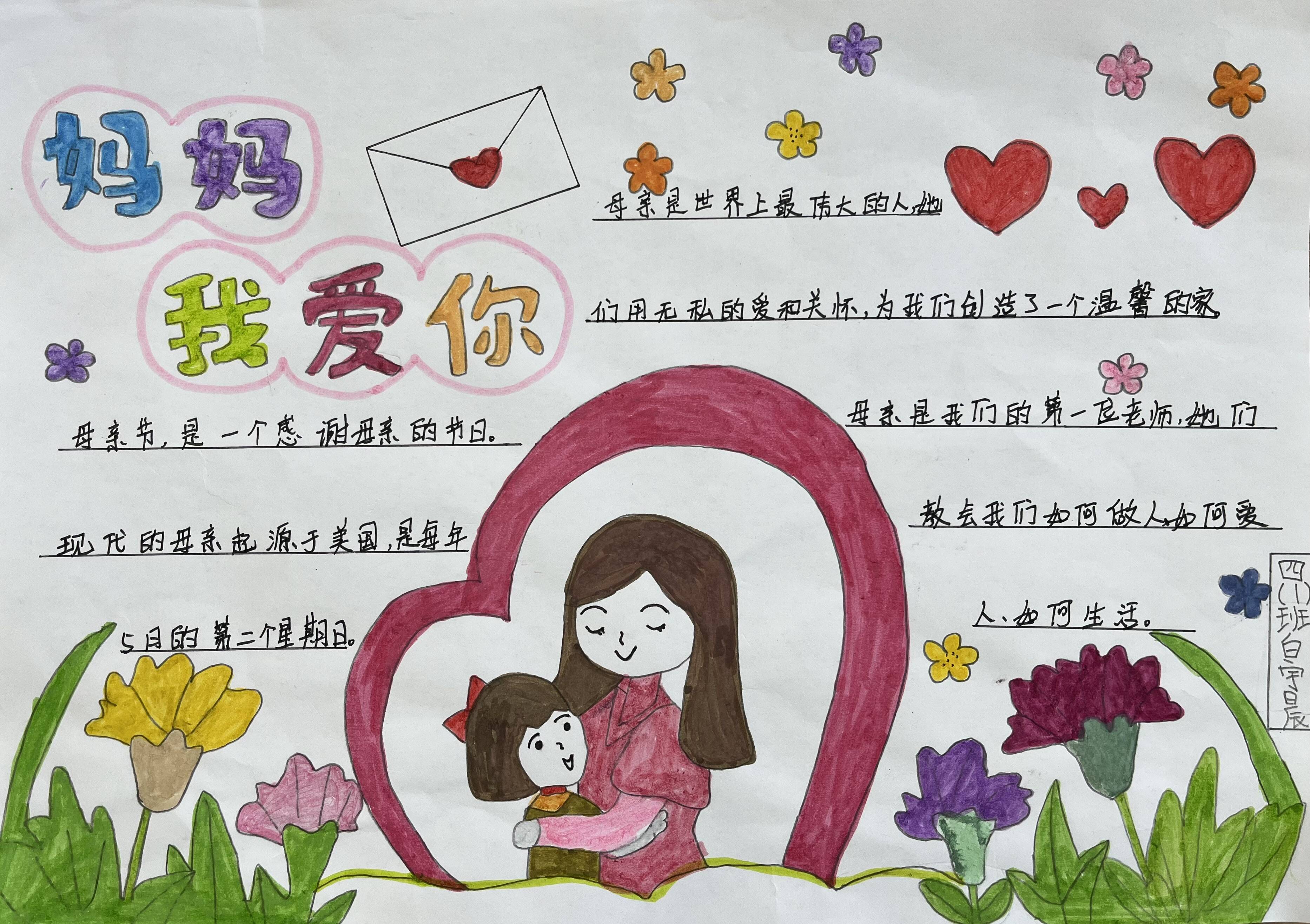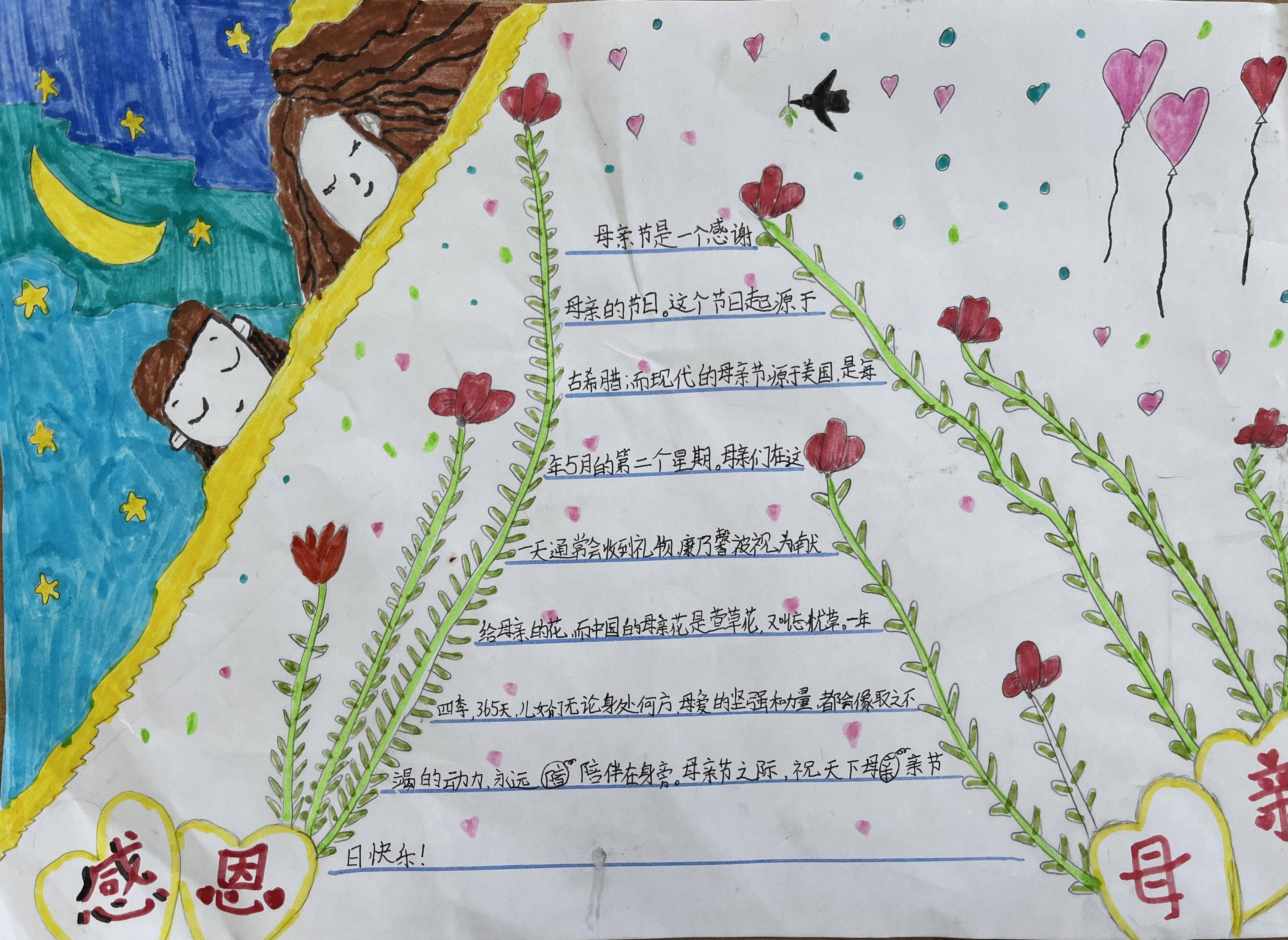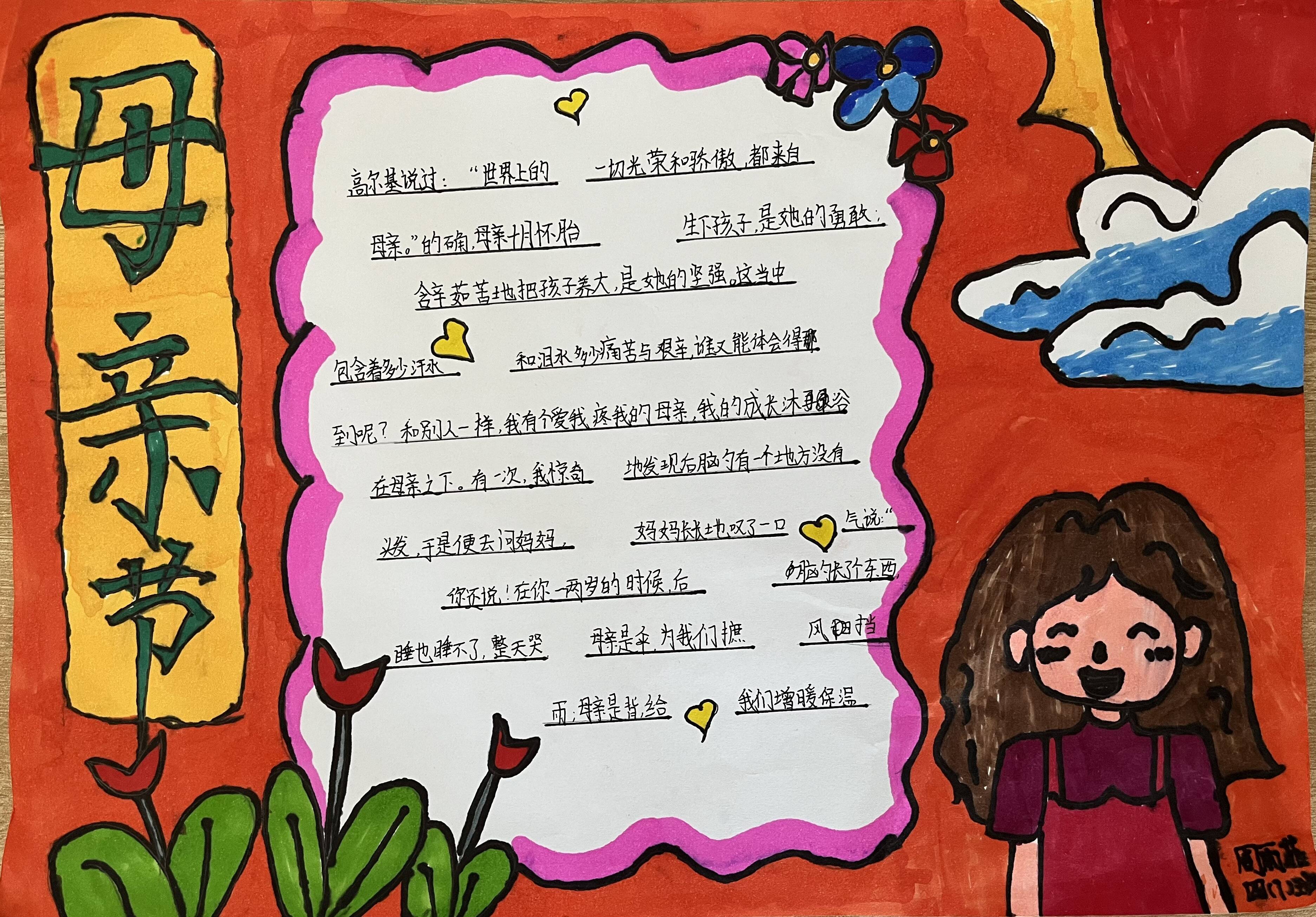 围绕此次主题,同学们积极收集素材、构思排版,从版面设计、文字书写、图案绘画等方面进行了巧妙的设计,呈现了一幅幅主题鲜明、内容丰富、版面匀称的精美手抄报。从母亲节的来历,母亲节的习俗,到赞美母亲的诗歌,孩子们用手抄报的形式表达对母亲的爱意,感谢母亲的辛苦付出。