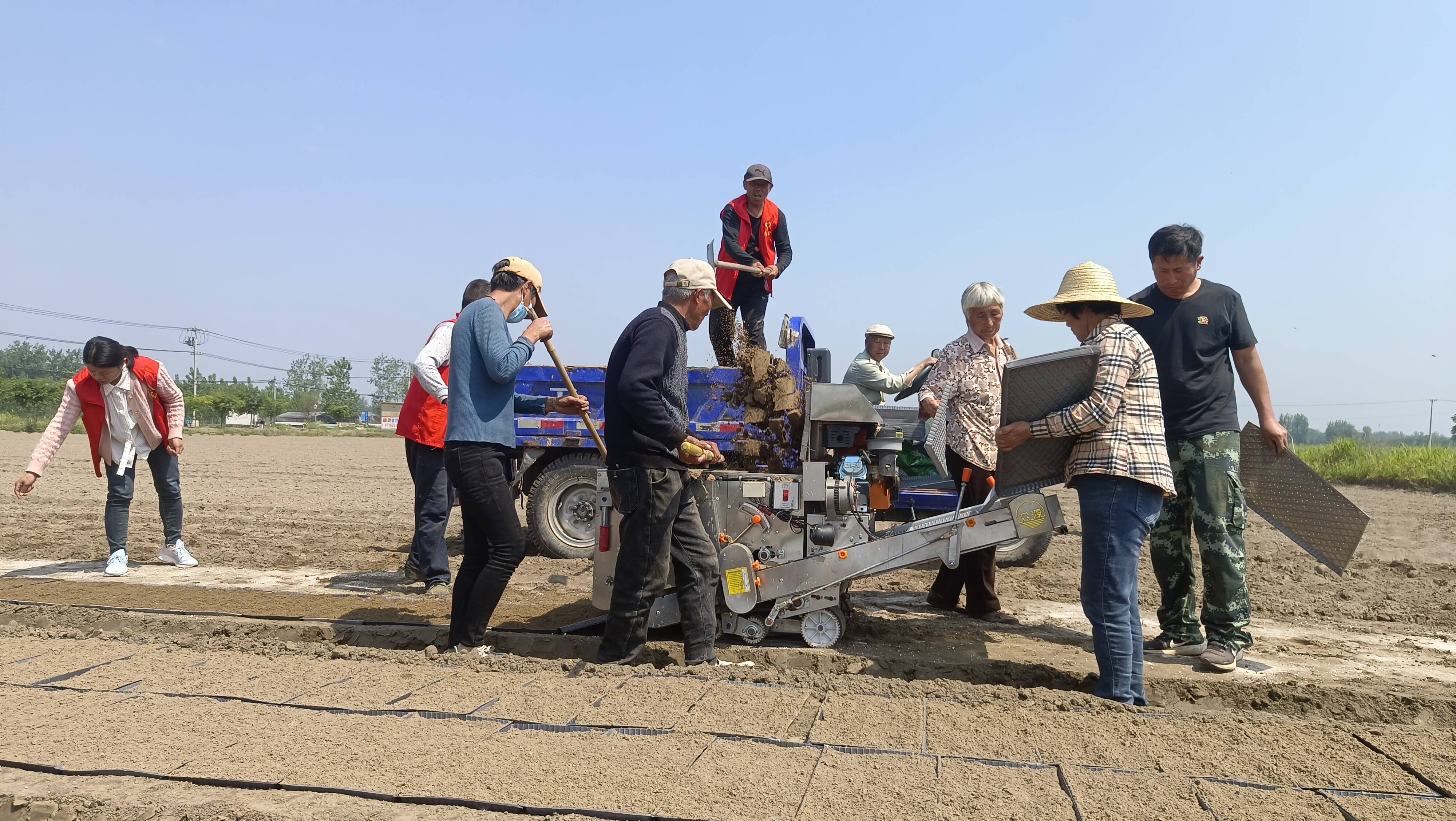 眼下正是水稻育秧的“黄金期”,5月13日上午,在铜山区房村镇房村村水稻育秧现场,一条水稻育秧生产线正开足马力加工生产,在多名村民及平安志愿者的配合下,相继完成装土、撒种等工序,随着机器运转,一个个播种均匀的育秧盘从“流水线”上传送出来。