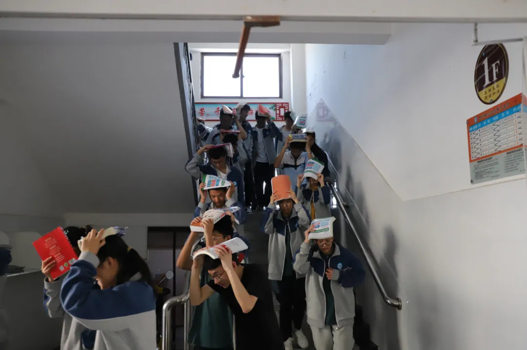 各班班主任又利用班会课向学生讲解地震的相关知识、应急避震的保护措施、逃生技巧,明确本次演练疏散路线和安全集结区域。5月14日大课间,演练开始,当地震警报声响起时,同学们迅速蹲下,躲在课桌底下,用书包或课本保护头部,紧接着哨声响起,同学们双手护头,降低重心,在班主任以及教学楼内各重点位置的教师引导下排队撤离,按指定路线安全有序地通过楼道,集结到操场。随后各班班长协助班主任清点人数并向现场指挥报告。