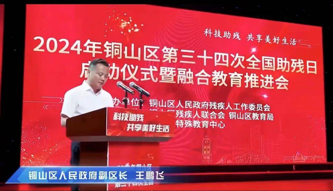 5月17日下午,由铜山区人民政府残疾人工作委员会主办,区残联、区教育局协办,区特殊教育中心承办的第三十四次“全国助残日”启动仪式暨融合教育推进会在铜山区融媒体演播大厅举行。今年全国助残日活动主题为“科技助残,共享美好生活”。徐州市残疾人联合会党组成员、副理事长李军、徐州市教育局基教处副处长裴洪光、铜山区人民政府副区长王鹏飞、铜山区政府办公室分管负责人杨标、铜山区残疾人联合会党组书记、理事长方程建、铜山区教育局党委书记、局长胡清华、铜山区教师发展中心副主任陈刚,区政府残工委成员单位代表、各镇(街道)残疾人代表、全区中小学校长、融合教育资源中心中小学老师,区特教中心师生共同参加了活动。