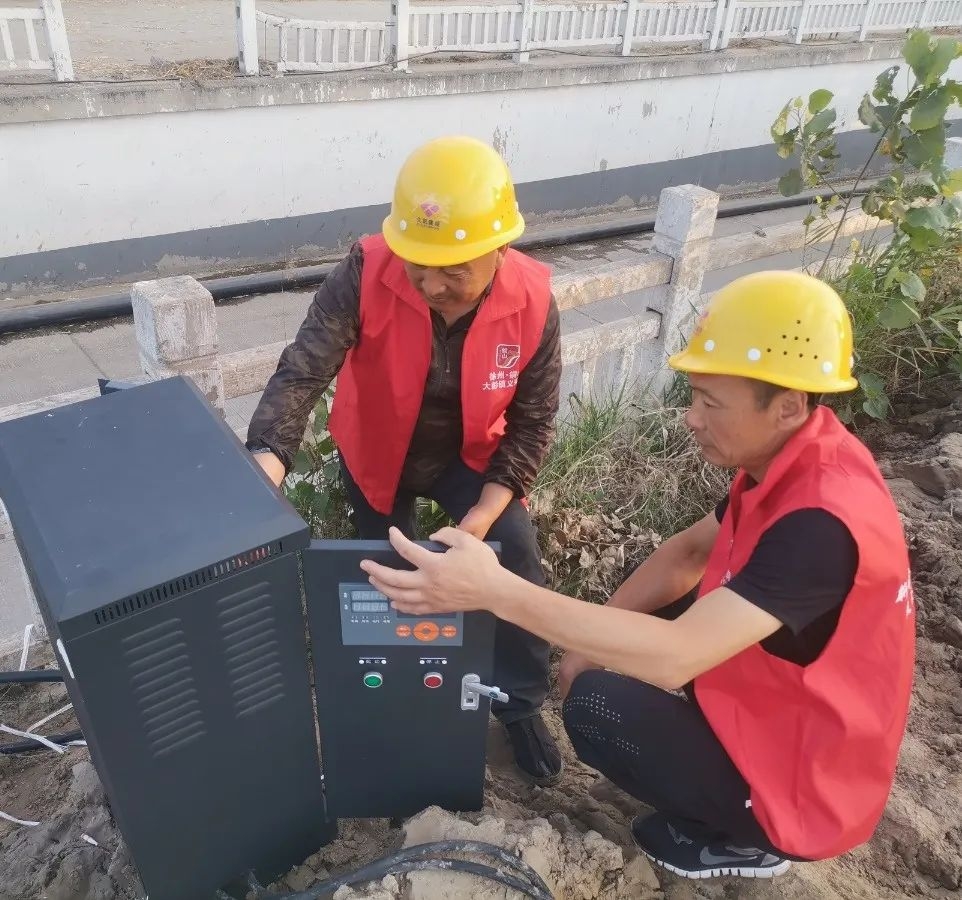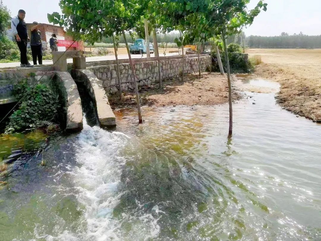 股股水流从管道喷涌而出,水花翻滚,顺着石渠通向远方,分流进地头的各个自然沟,村民们满心欢喜地忙碌着连接水带引水入田灌溉……这是6月12日上午,铜山区大彭镇雁群村翻水灌溉抗旱备播的场景。