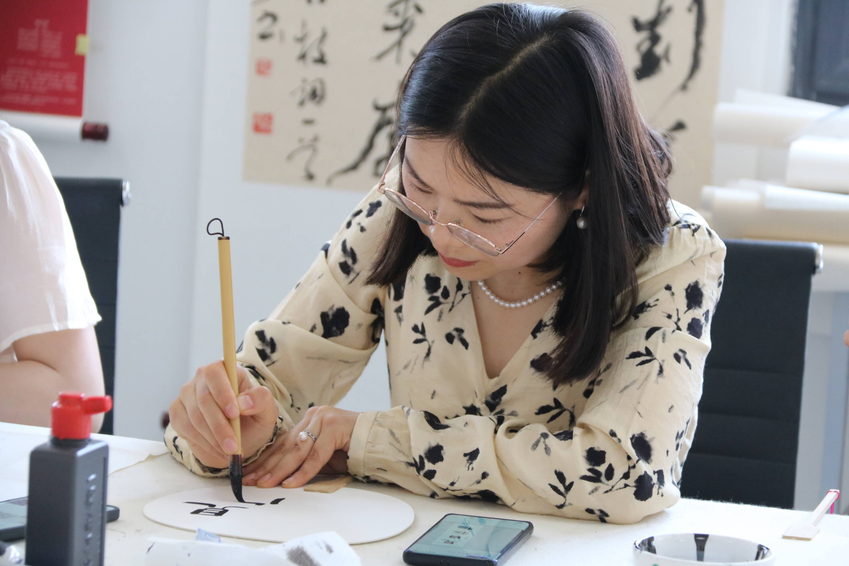 此外,为了让参与者亲自体验书写的乐趣,感受书法背后的文化内涵。教师们还现场撰写软笔、硬笔书法作品。