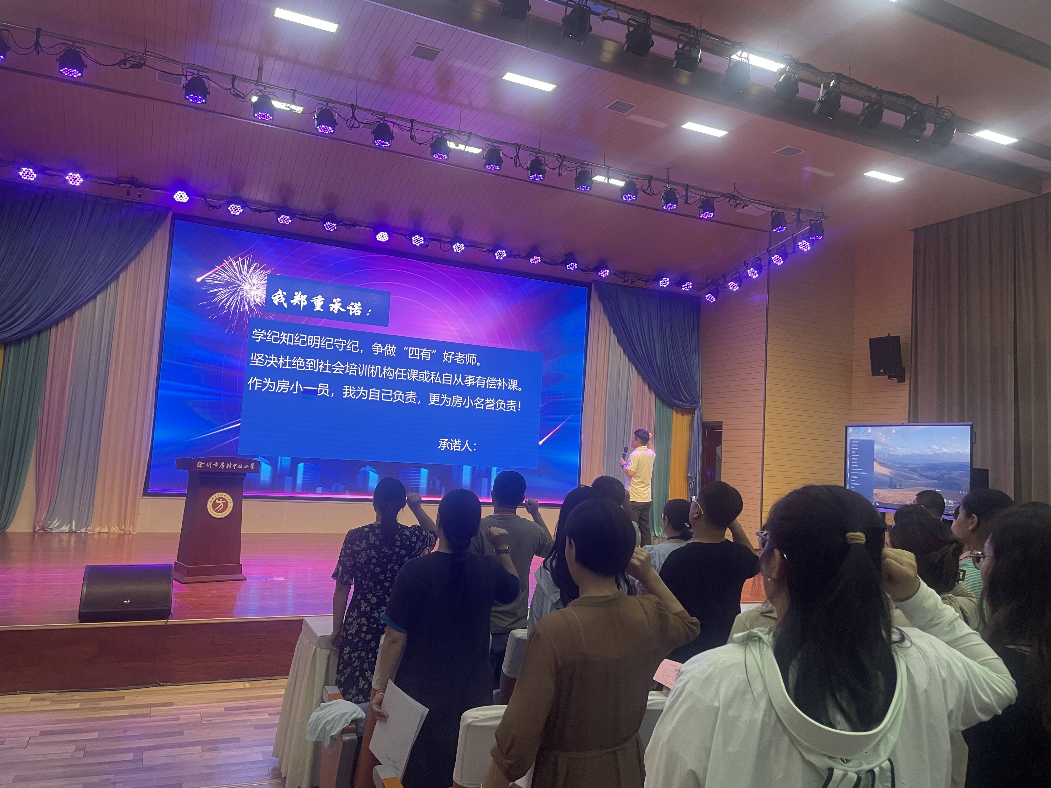 随后,在王玉峰副校长的带领下,全体教师进行了庄严的集体宣誓。教师们郑重承诺,将严格遵守师德规范,自觉抵制违规补课行为,以实际行动践行教师的崇高使命。宣誓现场气氛庄重而热烈,展现了教师们坚定的决心和信念。