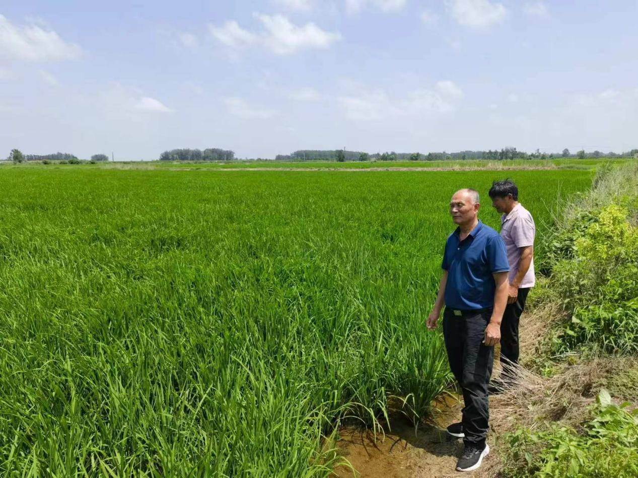 苗庄村党支部书记蒋立平带领村干部到合作社稻田地查看水稻长势情况,并联系技术人员指导水稻的施肥打药作业。该村实施“党建+股田制”,成功流转土地600亩,主要种植水稻、玉米,预计每年为村集体增加收入15余万元。