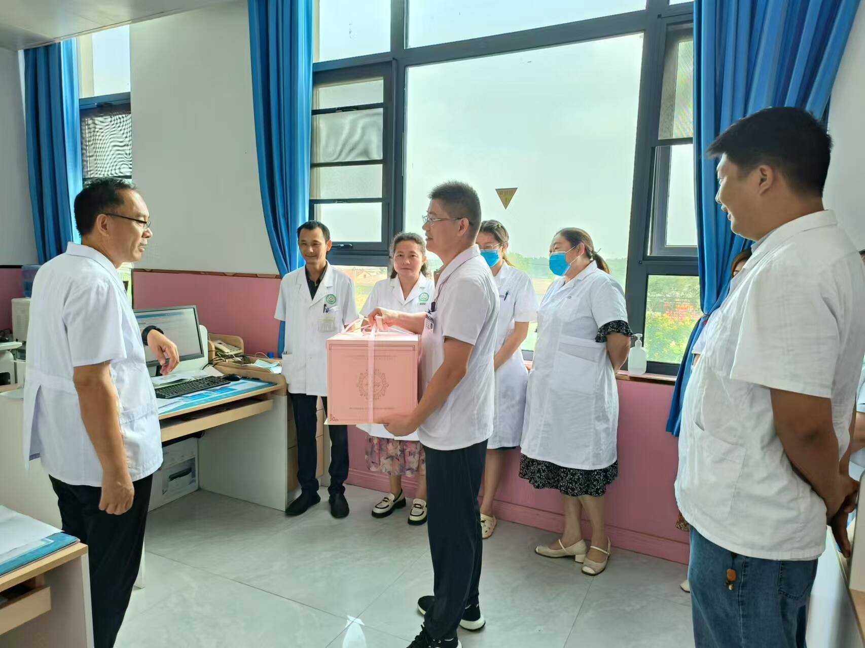 8月19日上午,单集镇卫生院党支部书记、 院长闫晓伟,副院长朱祥文等领导及相关行政部门门负责人到医生办公室、医技科室亲切慰问坚守在一线的医师们,给他们送上蛋糕,并致以节日的问候和祝福,对他们为医院医疗卫生事业发展工作所作出的贡献表示感谢。闫院长说:“医师节是广大医务工作者的节日,也是让医者牢记使命、感受职责神圣的时刻,大家有着自己坚定的信念,始终坚守自己的职责与使命。坚信自己所从事的事业,用心做一个有温度医者!”