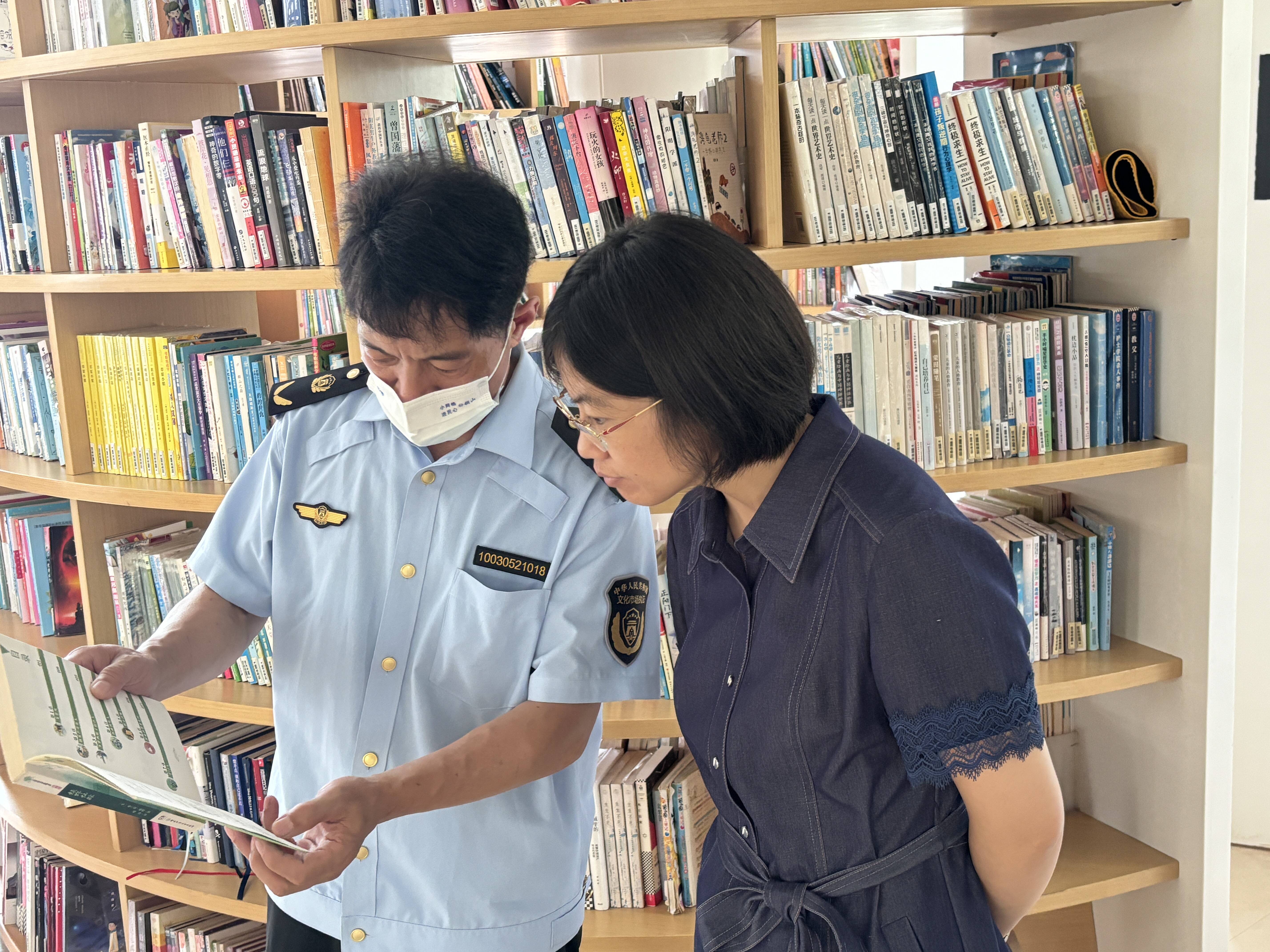 在绪权印刷厂,文化执法大队的队员们查看了该企业的《出版物经营许可证》和其他证件的上墙情况,同时向印刷厂负责人普及了相关法律法规,强调了合法经营的重要性。随后,一行人又来到了千禧城书店。这里各式各样的书籍琳琅满目,还有好多小朋友们在图书角安静地读书。文化执法大队的执法队员们仔细查看了每一本书的ISBN号、出版社信息、印刷质量等,“盗版书物的封面印刷颜色会更深,内容页的色彩也会比正版书物清晰,色条也会出现缺色现象。”孙禹副大队长现场指导参训人员和书店店员们如何在日常工作中有效识别并拒绝销售盗版书籍和非法读物。