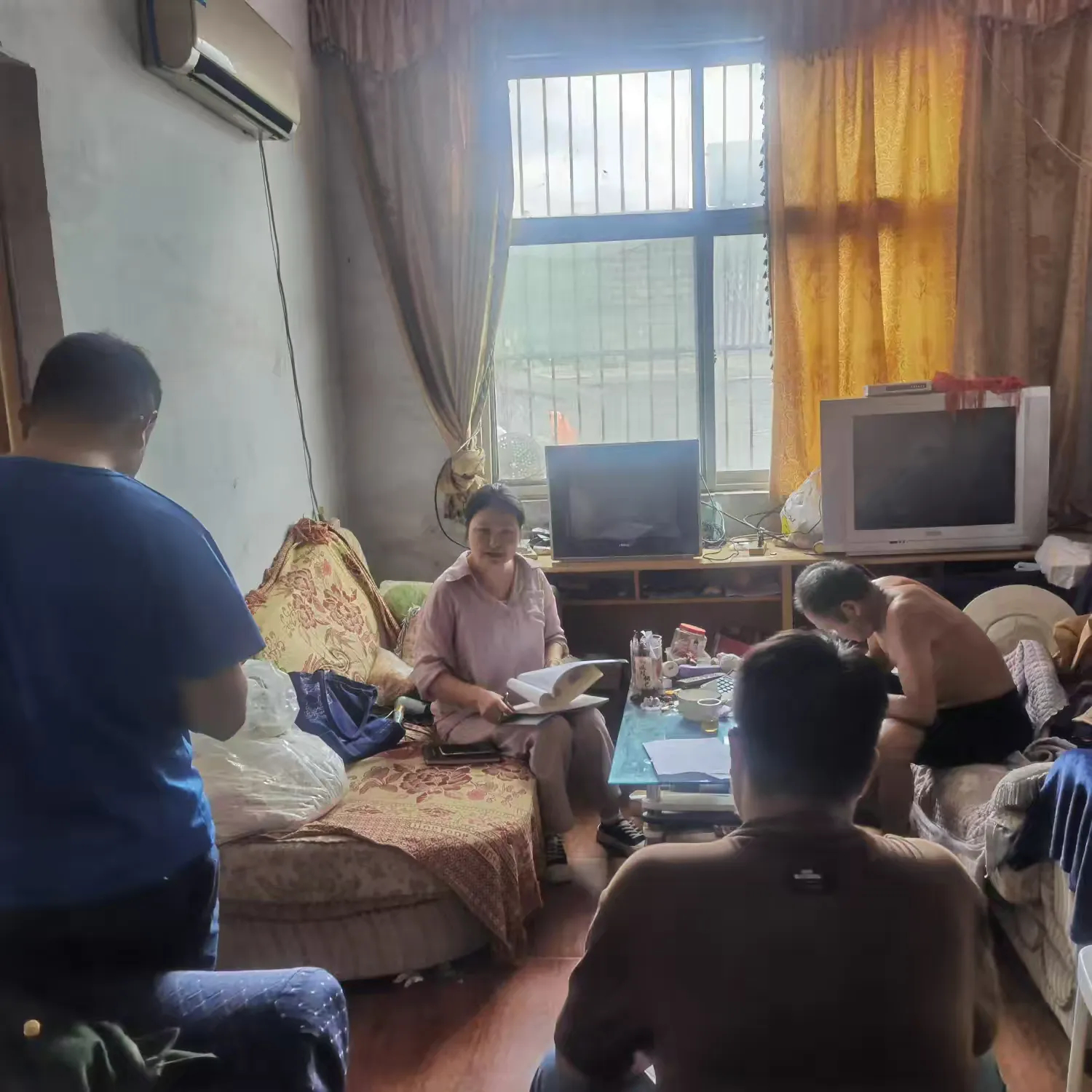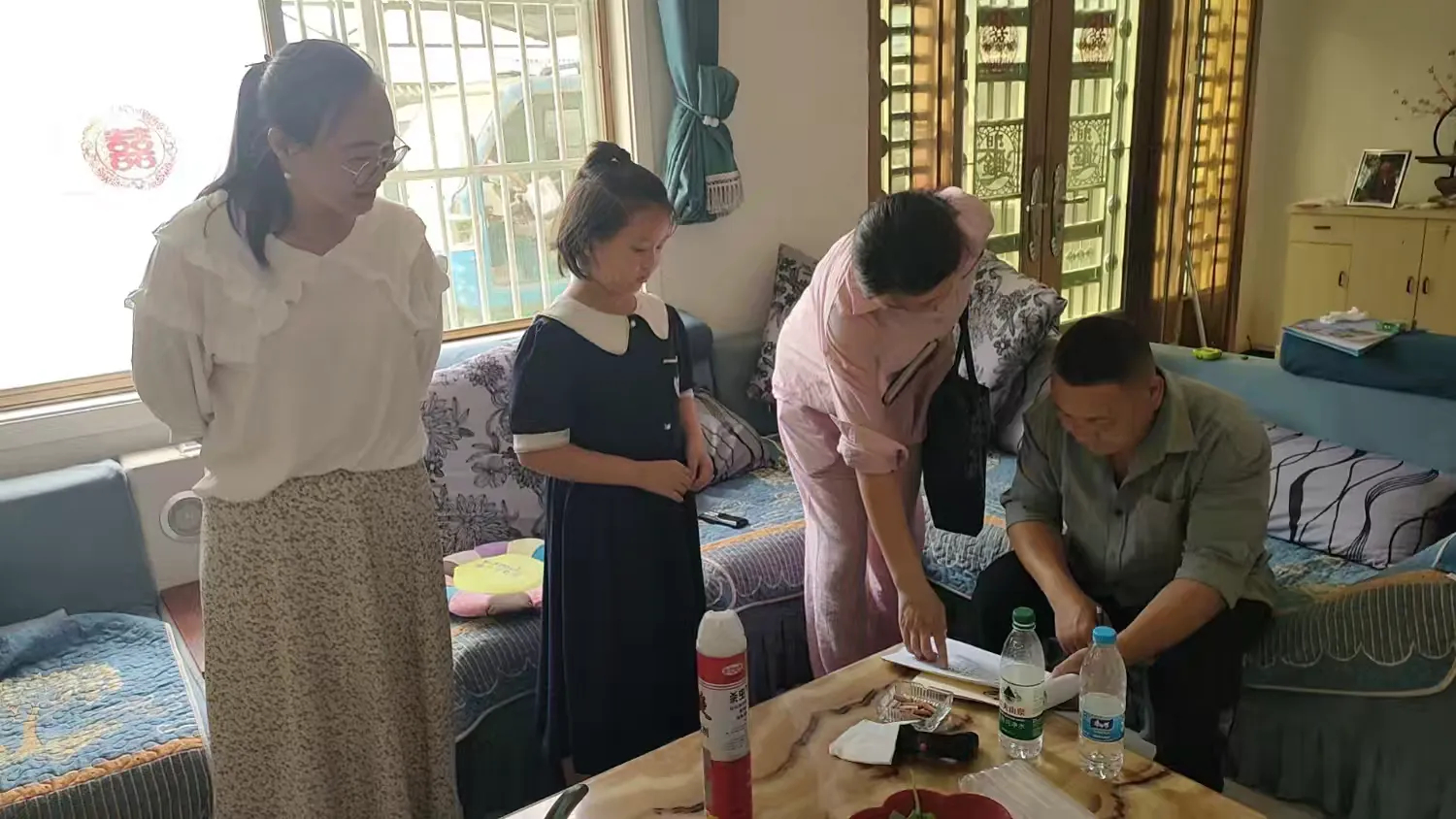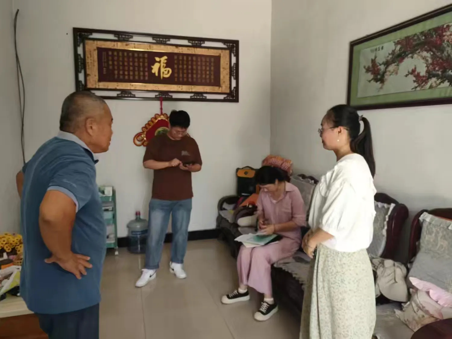 区领导和村干部走访记账户,关心的询问他们记帐中是否有问题,给他们讲解记帐注意事项。