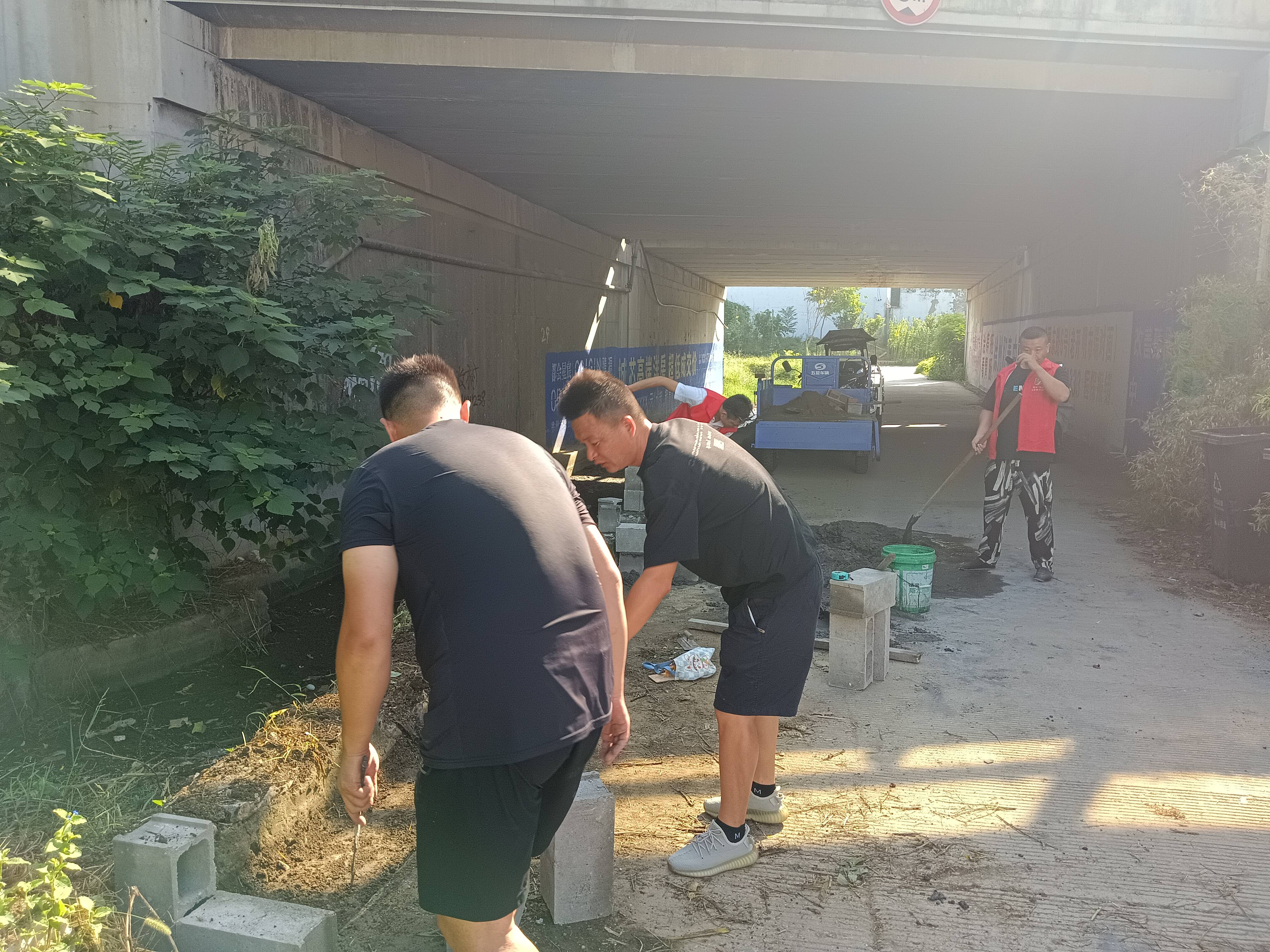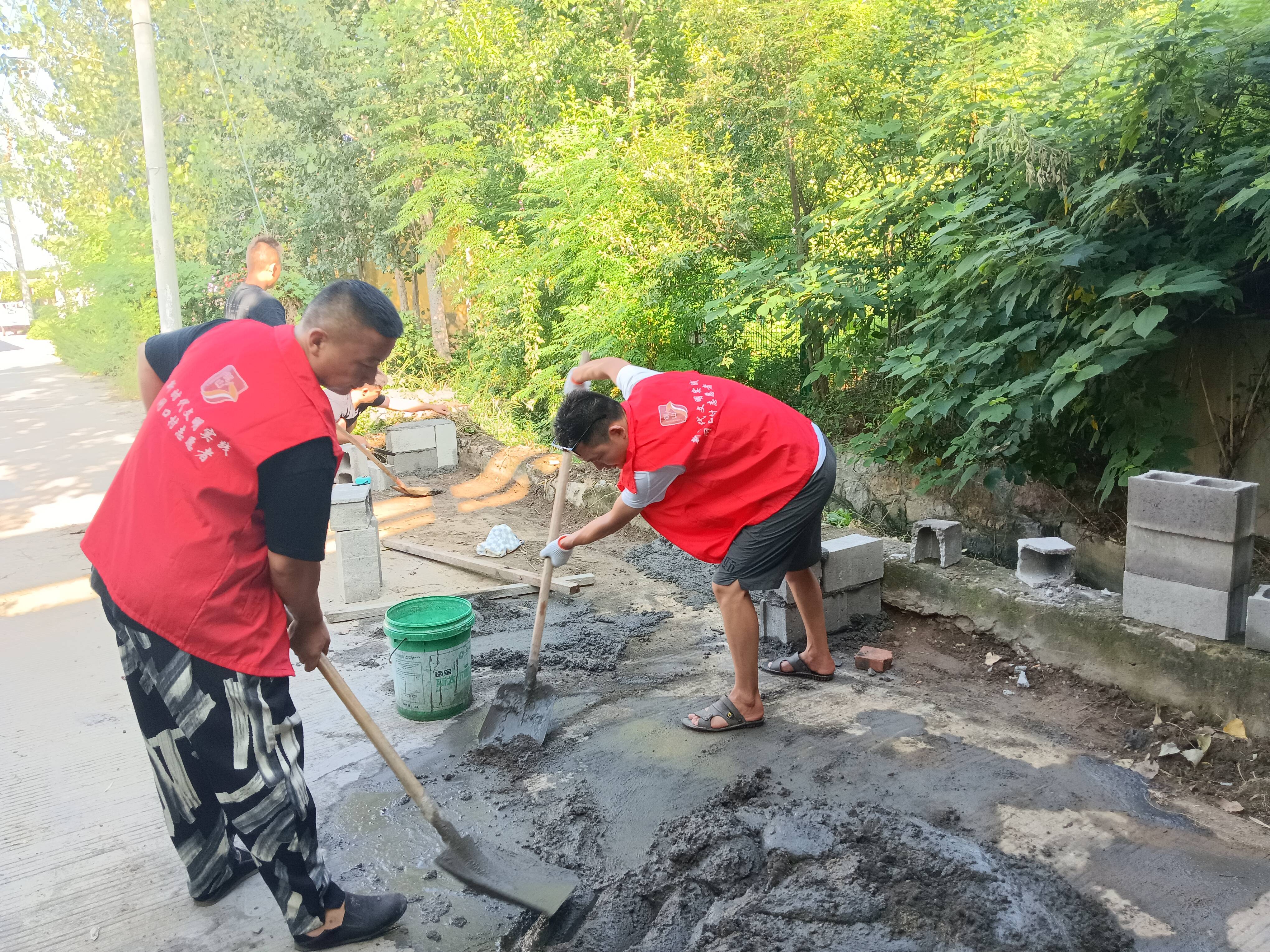 修补中,工作人员和志愿者不怕脏、不怕累,大家一起搬运沙石、搅拌水泥、铺设路面,工作现场,大家分工合作,默契配合,呈现出一派热火朝天的劳动景象。
