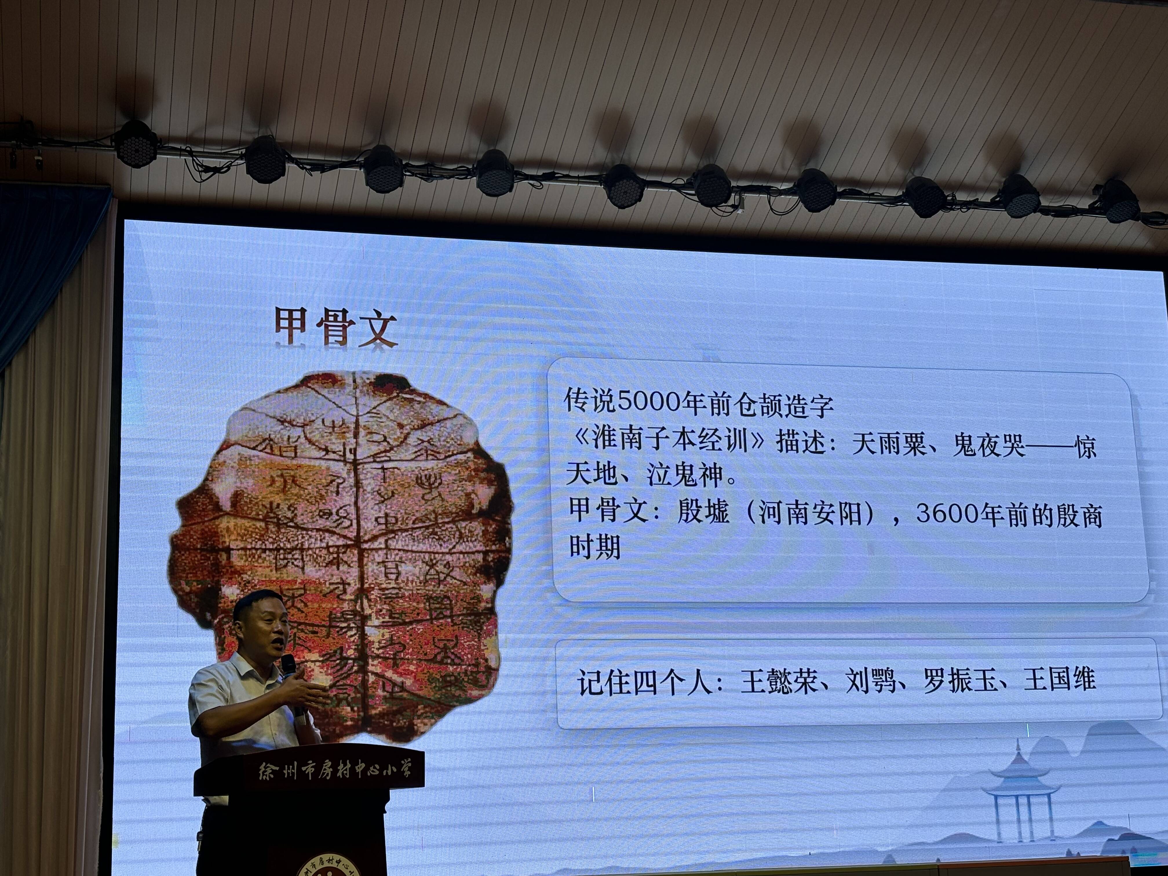 房村镇小学中心校校长滕绍龙发表讲话,教师不仅仅是教学生断文识字,更要让学生发自内心的爱上我们的文字。滕校长介绍了文字的演变是一部波澜壮阔的历史画卷,从古老的甲骨文到如今的简体汉字,文字经历了数千年的发展历程。