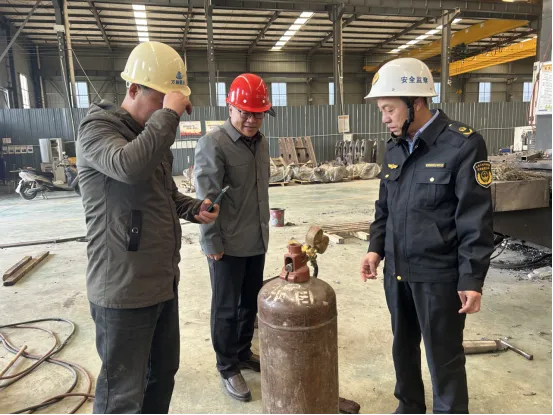 在权寨村方展“厂中厂”,检查组检查了喷塑车间是否存在积尘、喷塑车间电器是否防爆、气瓶是否设有防倾倒措施等重点情况,发现气瓶气带严重老化、气瓶接口处未用专用管束、气瓶压力表盘损坏、车间内存放电动车等隐患,现场给出合理的整改建议并要求企业安全管理人员限期完成闭环管理。
