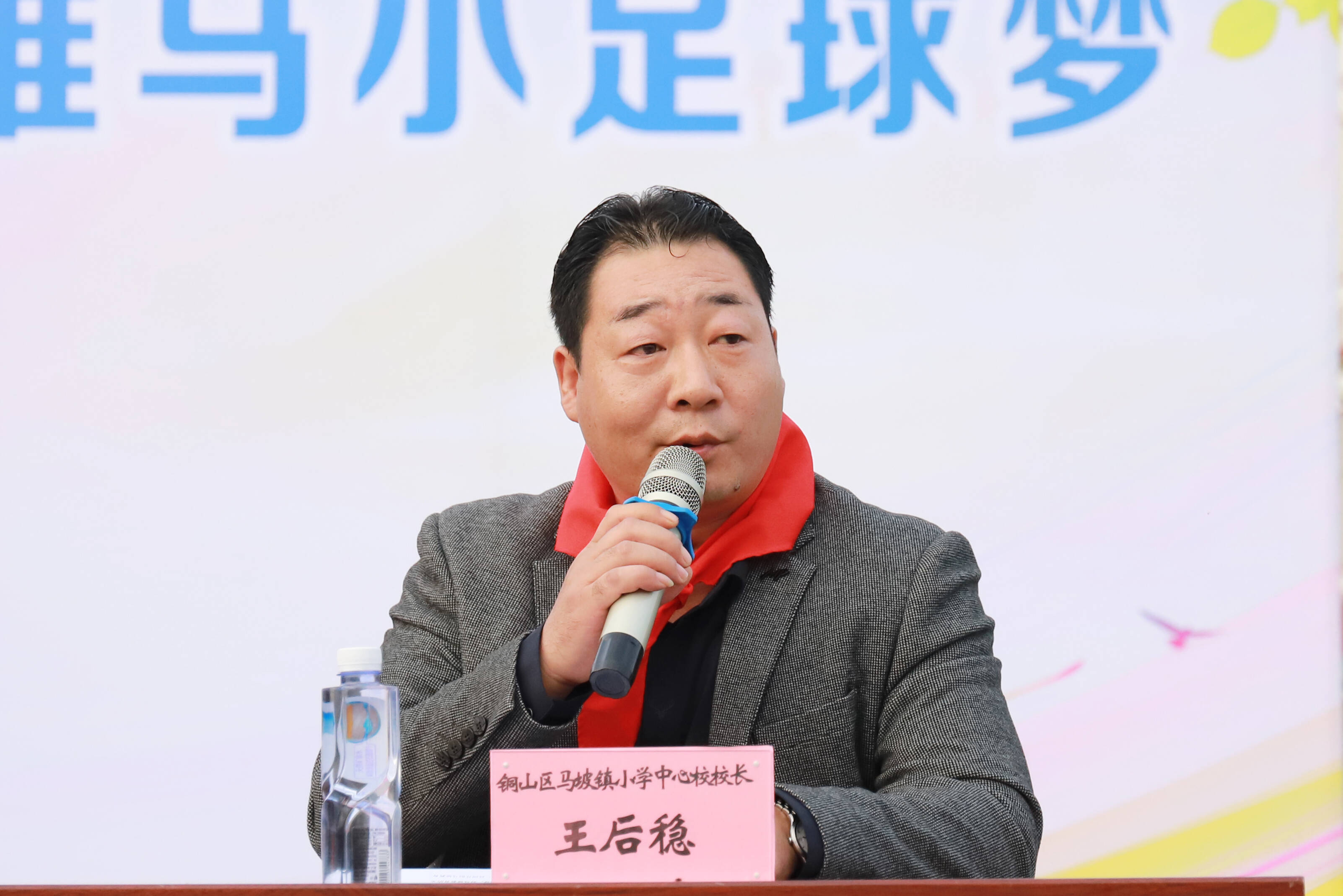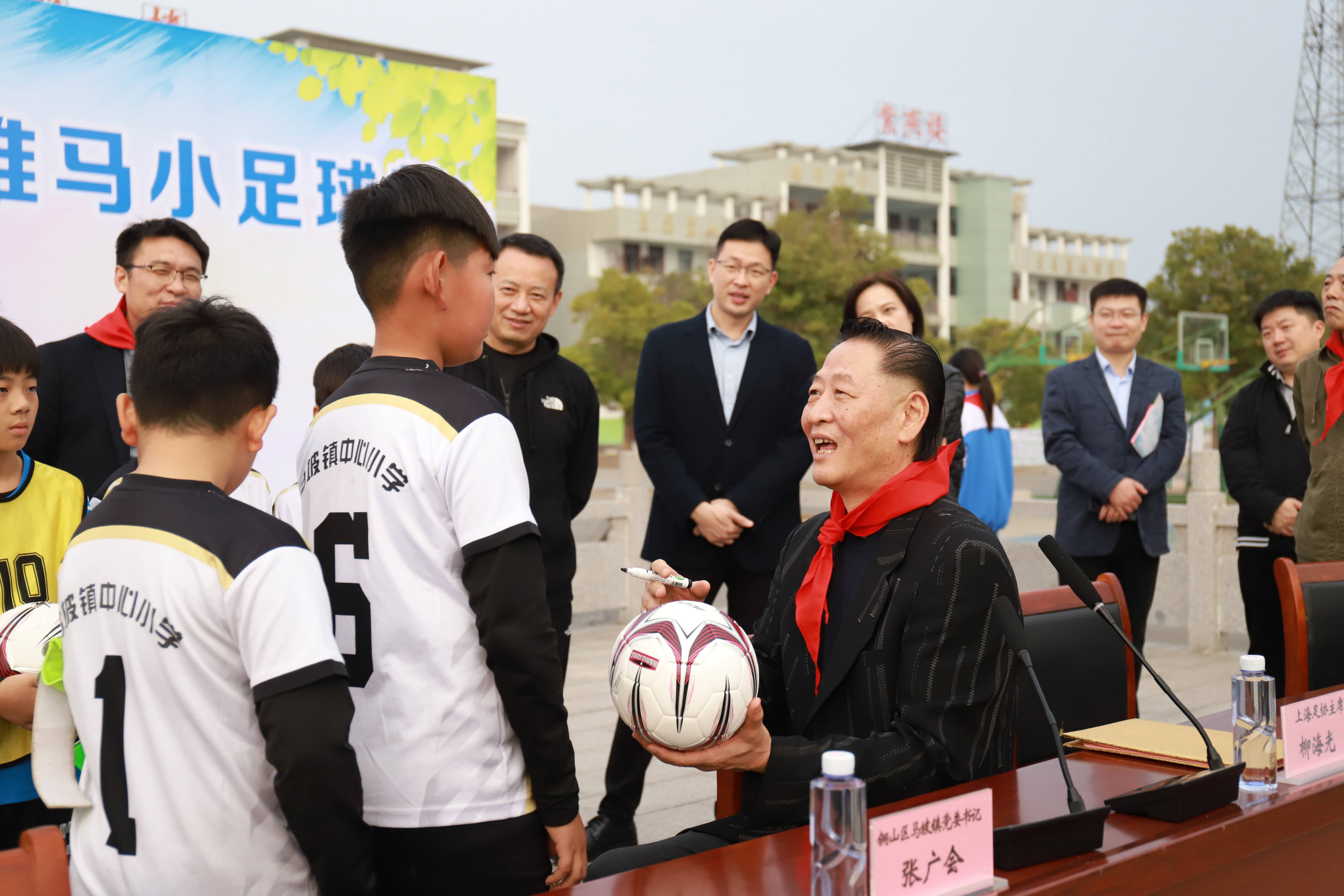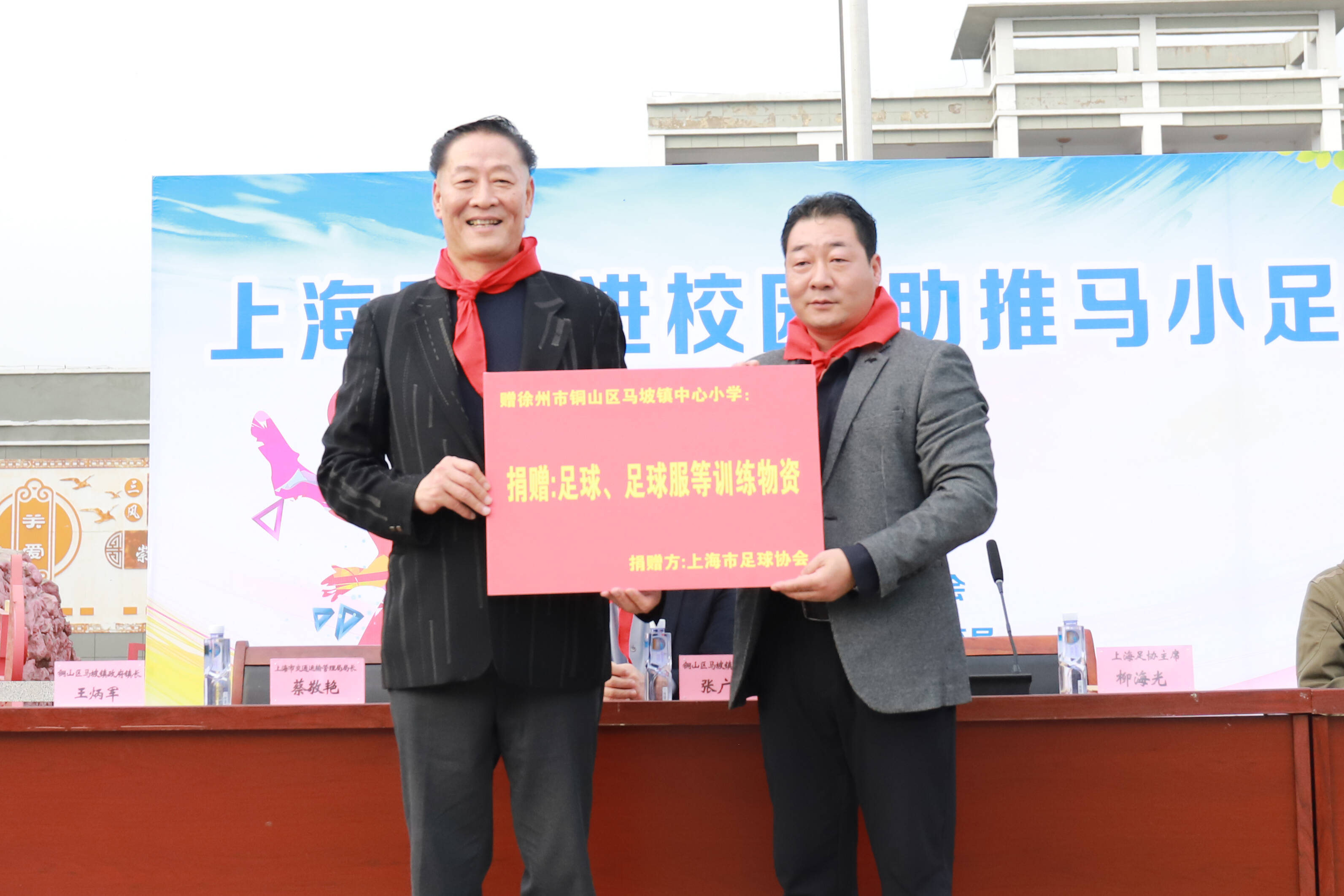 捐赠仪式上,上海市足球协会向马坡镇中心小学捐赠足球、足球服等训练装备,镇小学中心校校长王后稳代表镇中心小学接受了捐赠。