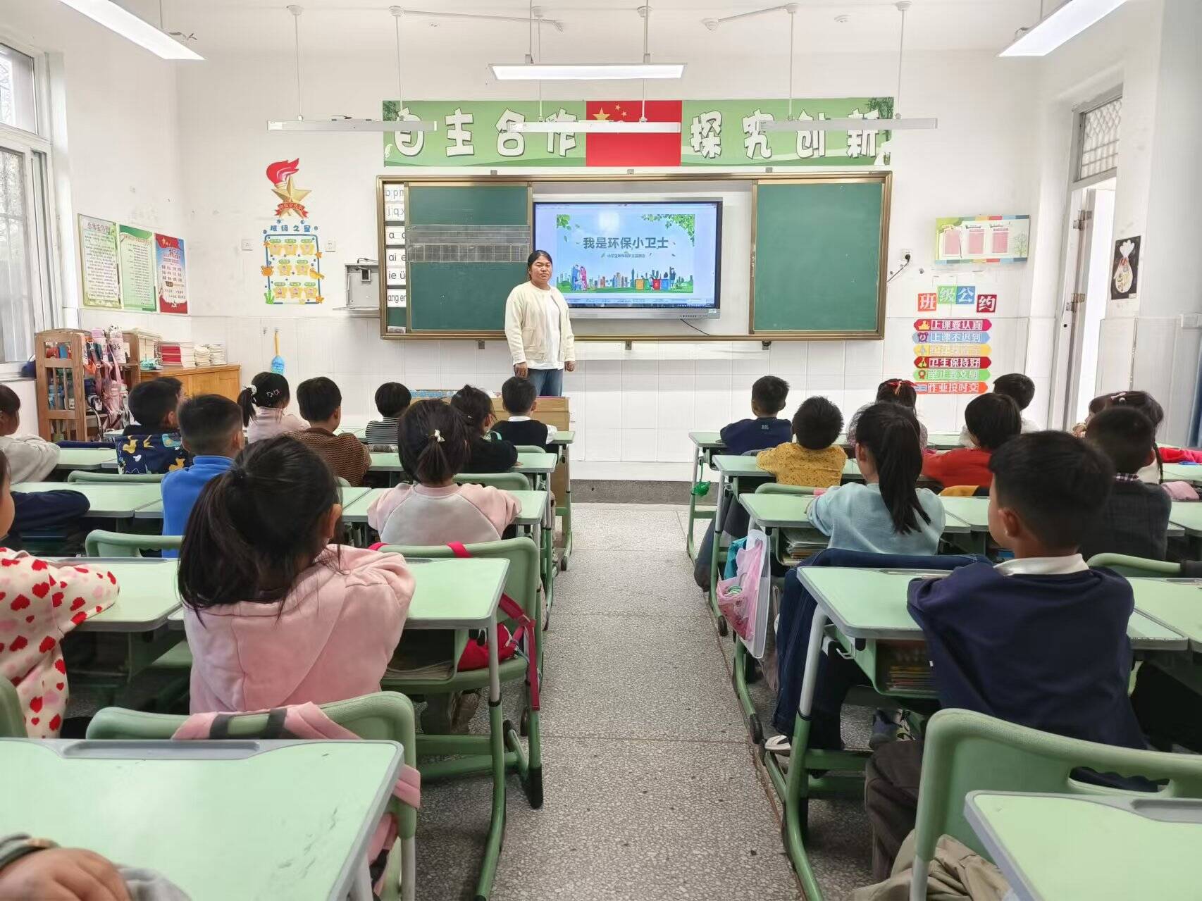随后,班主任老师邀请了学生代表分享自己在日常生活中遇到的环保小故事,以及自己是如何践行环保理念的。有的同学讲述了自己如何说服家人减少使用塑料袋,改用环保购物袋;有的同学则分享了自己参与校园垃圾分类活动的经历和感受。这些真实的故事,不仅让同学们感受到了环保就在身边,也激发了大家参与环保行动的热情,还向学生们普及了校园环保的重要性以及如何成为一名合格的校园环保小卫士。