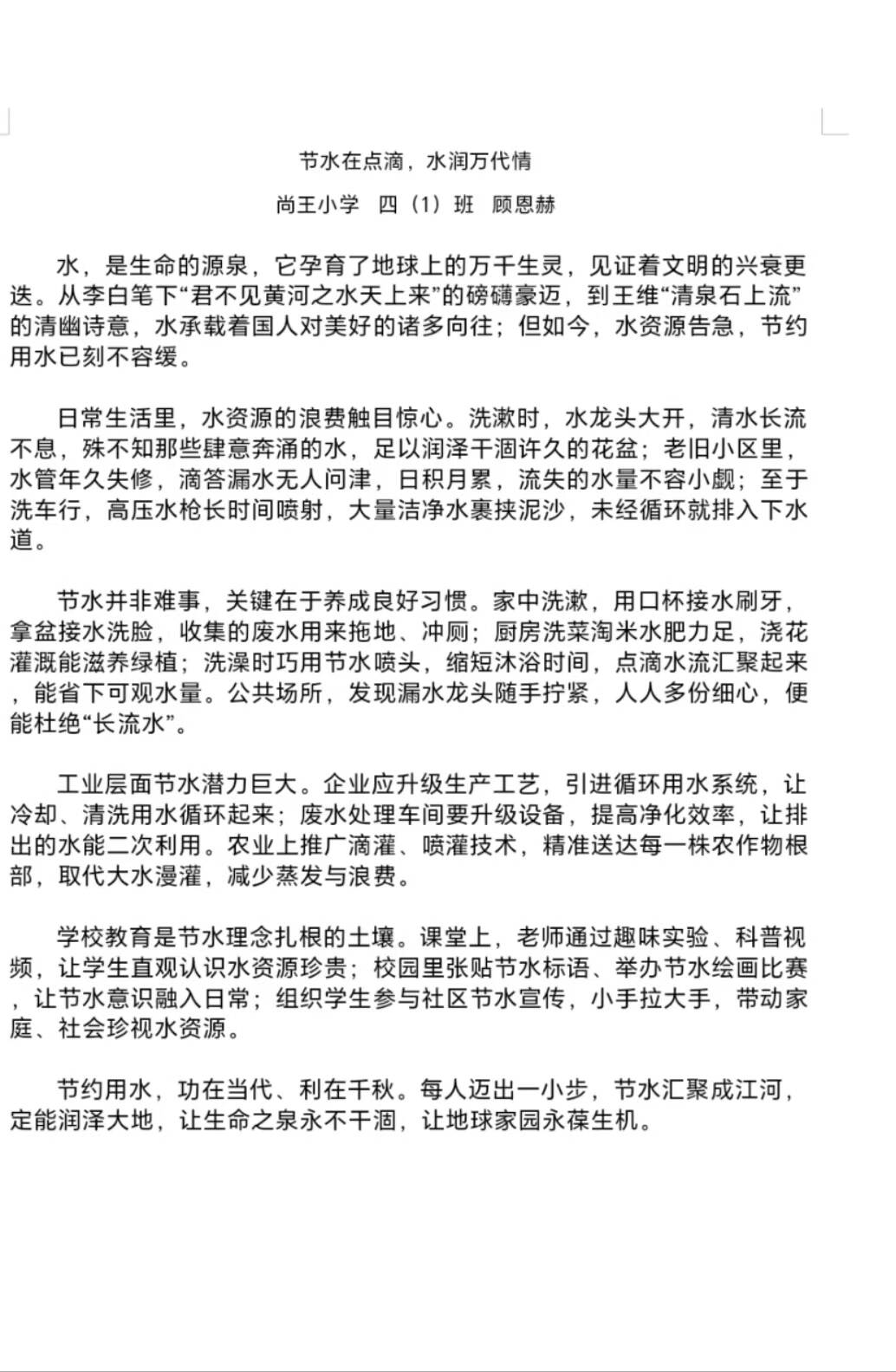 同学们积极响应、认真创作,交出了众多优秀稿件。一起来看看尚王小学的孩子们讲述的身节水爱水故事!