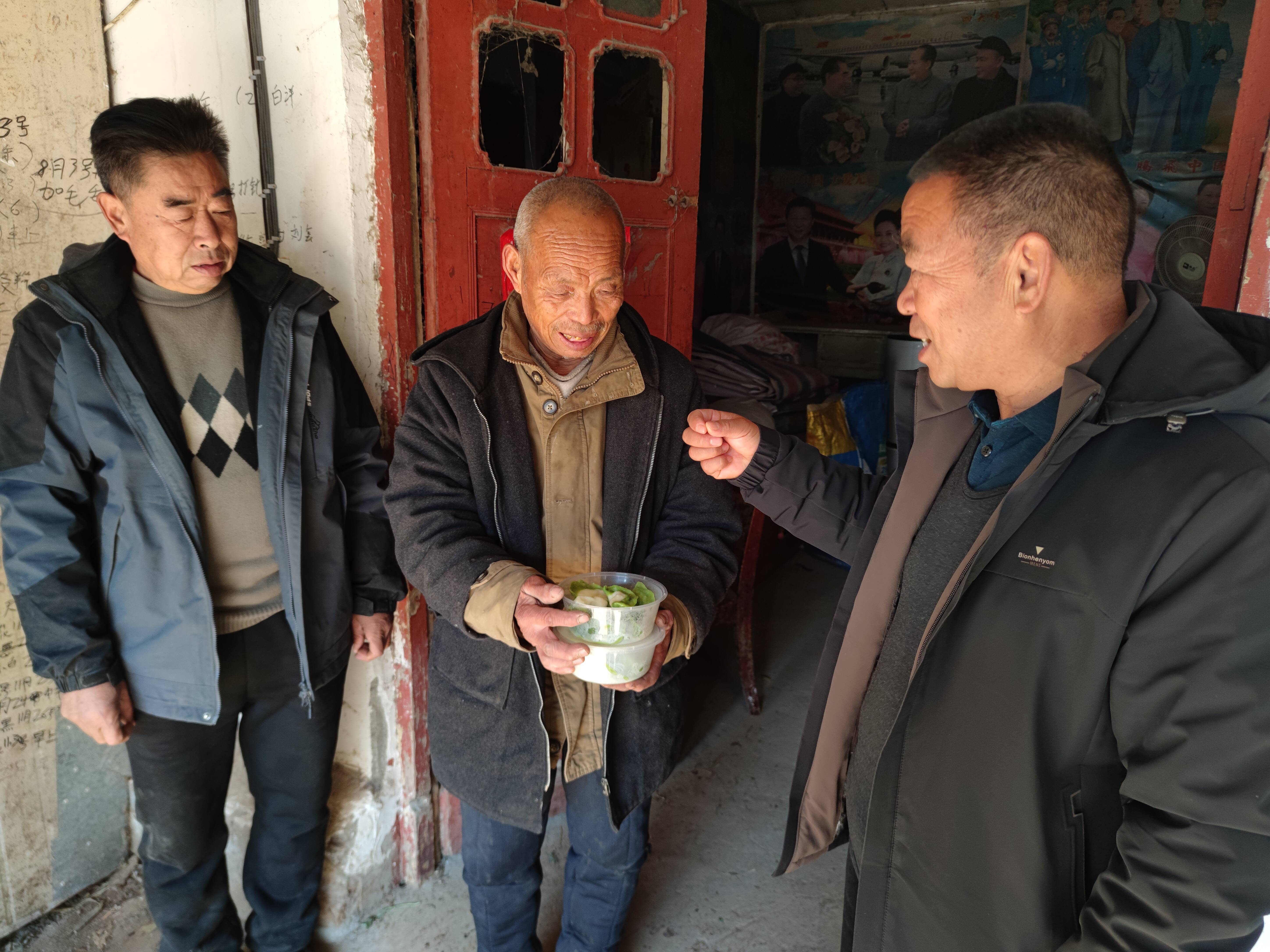 在众人齐心协力之下,一盘盘热气腾腾的饺子新鲜出炉,香气扑鼻,弥漫在四周。权寨村党支部书记胡兆春带领着志愿者们,怀揣着满满的心意,将这一份份温暖的饺子挨家挨户送到独居老人和五保户的家中,五保户权学德双手接过饺子,轻轻咬上一口,不禁连连称赞:“真香啊,这味道真地道!”胡兆春更是亲切地与老人们展开交流,仔细询问他们近日所需的生活物资,以及生活中遇到的困难和不便之处,老人们纷纷打开了话匣子,你一言我一语地诉说着,他们由衷地表示,如今村里对他们关怀备至,时常有这样温暖的举动,心中满是慰藉。