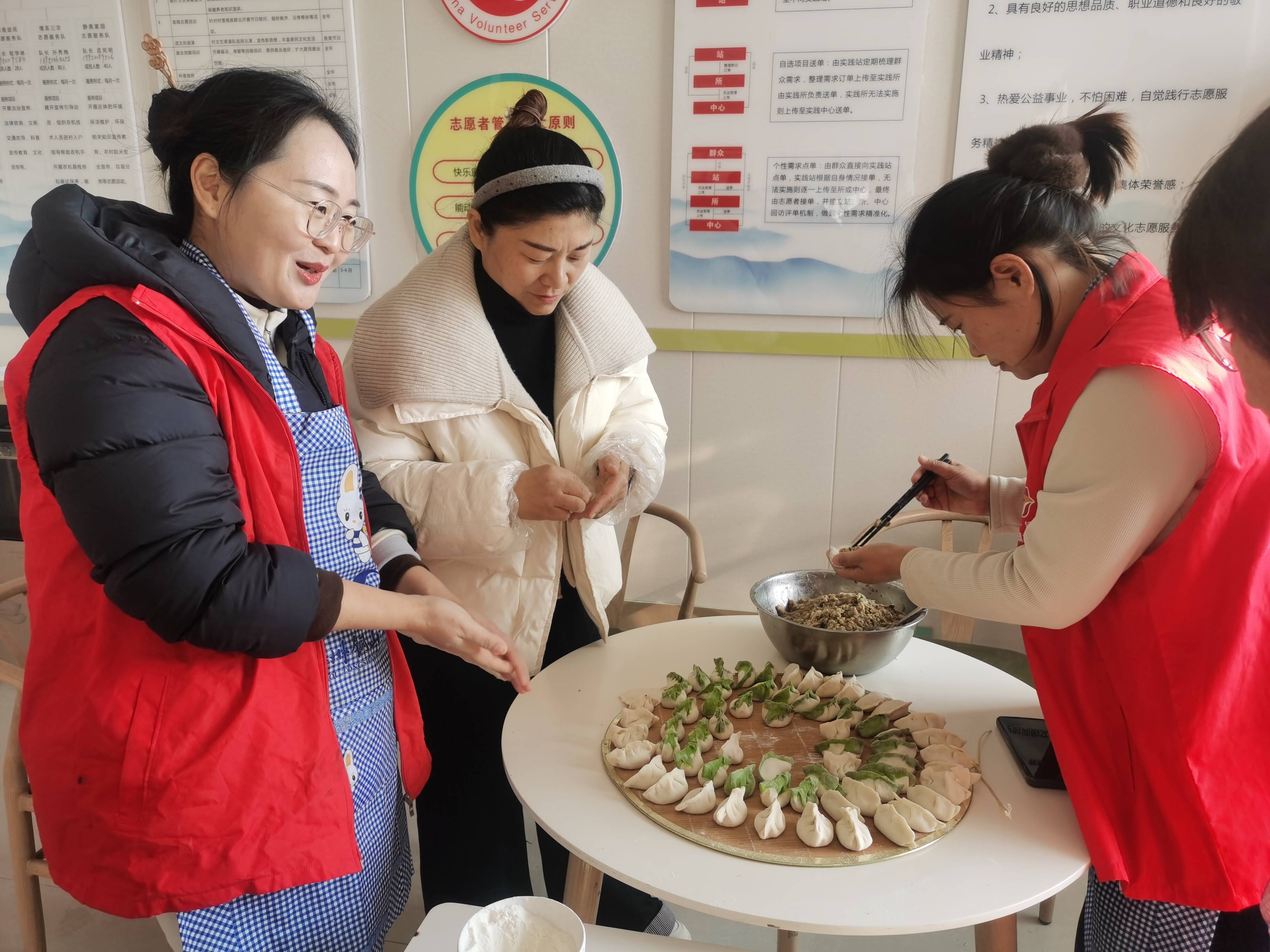在权寨村,志愿者们共同投身于包饺子的欢乐氛围之中。现场分工细致明确,大家配合得极为默契,剁馅、调味、包馅等各个环节有条不紊地稳步推进,志愿者包馅的手法娴熟,填馅、捏褶一气呵成,还创新采用“彩色双拼”面皮儿,不多时,一盘盘圆润饱满、形如元宝的饺子便整整齐齐地摆满了桌面,“白绿双拼”色泽明亮,宛如一颗颗“大白菜”,“卖相”十分好看。