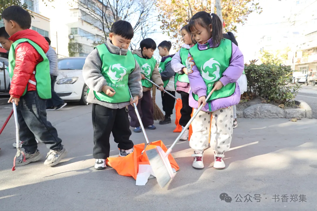 拿到工具的幼儿园大班的小朋友,在路边、草地上捡拾垃圾和落叶,亲身体验环卫保洁的劳动过程,从小树立保护环境人人有责的意识。
