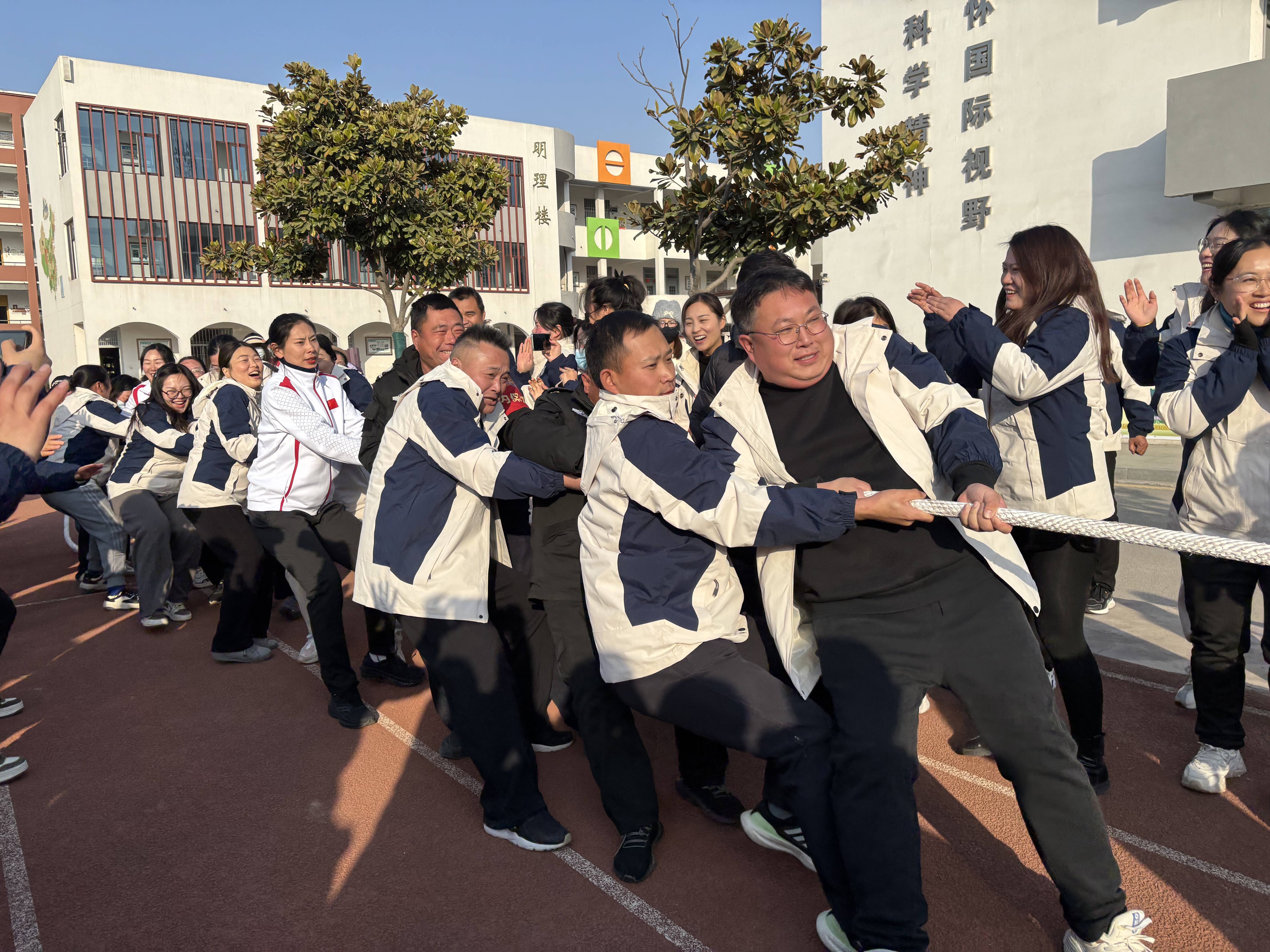 力拔山兮气盖世!最具重量级的拔河比赛开始了,大家鼓足了劲,涨红了脸,抓紧了绳,全力以赴,心往一处想,力往一处使,喊着整齐响亮的口号“一二、一二……”有节奏地向后拖拽绳子,咬紧牙关,用尽“洪荒之力”,势必勇夺桂冠!一根绳,拉起了一场对弈;一股劲,团结成了一条心。