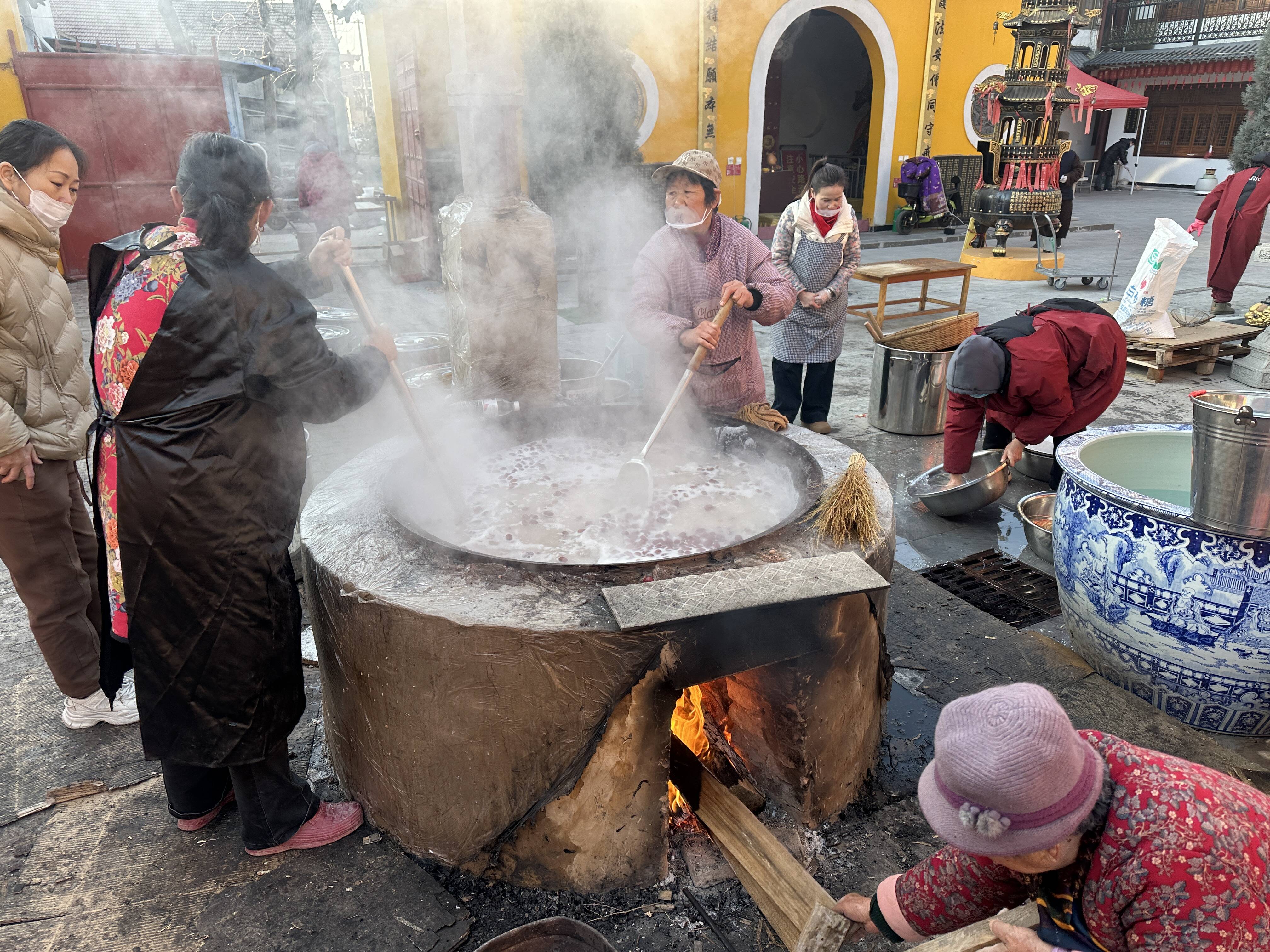 腊八节清晨,志愿者和僧人们早早地开始熬粥。厨房里,大锅中的食材在小火的熬煮下慢慢翻滚,志愿者耐心地搅拌着,空气中弥漫着腊八粥的香甜气息。这种传统的熬粥方式,传承着古老的文化,也倾注了大家的爱心。