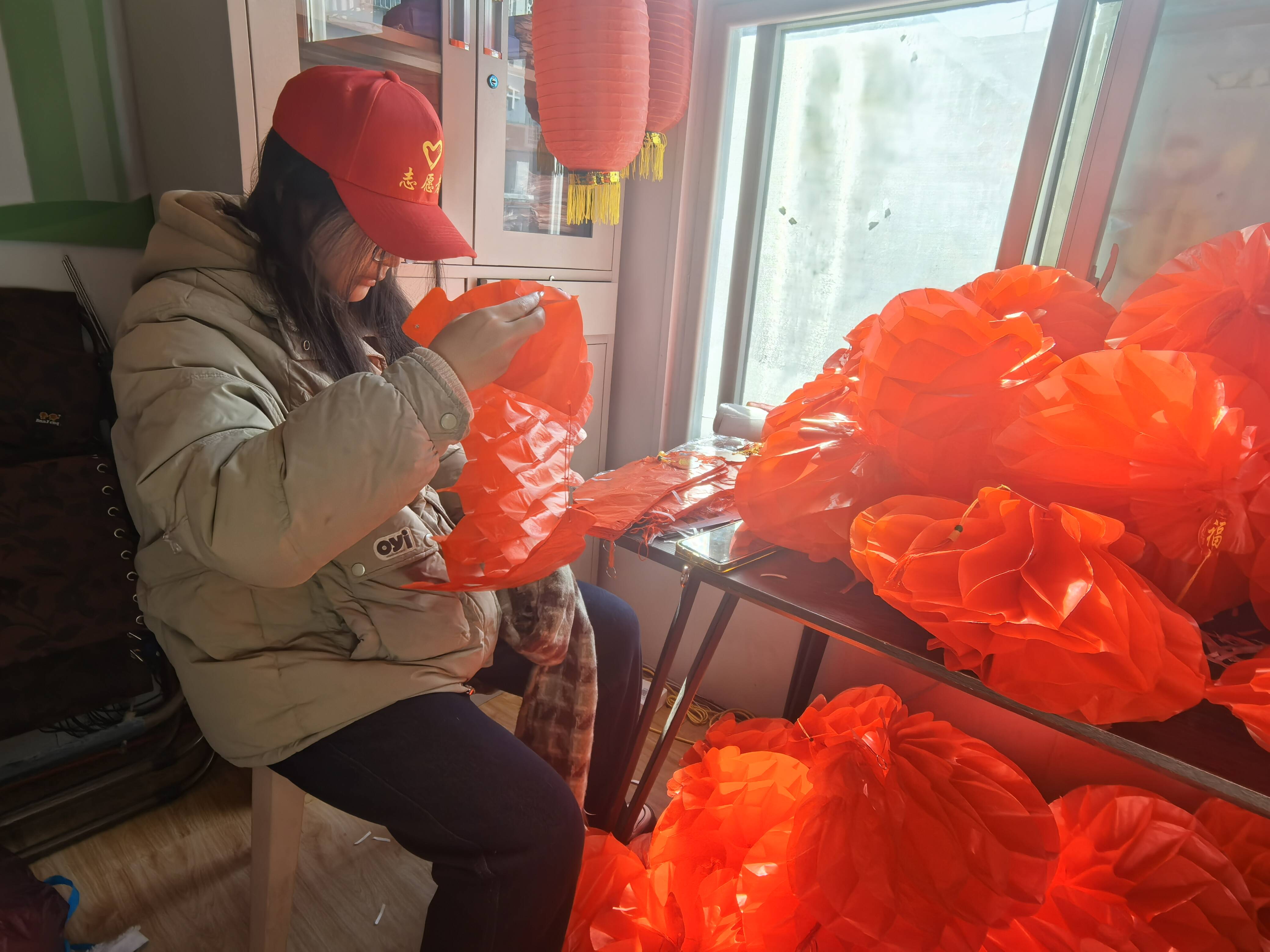 志愿者们制作灯笼并挂在步行街两侧,为节日增添浓厚喜庆氛围。大学生谢灿表示,看到家乡在大家努力下充满年味,倍感自豪。