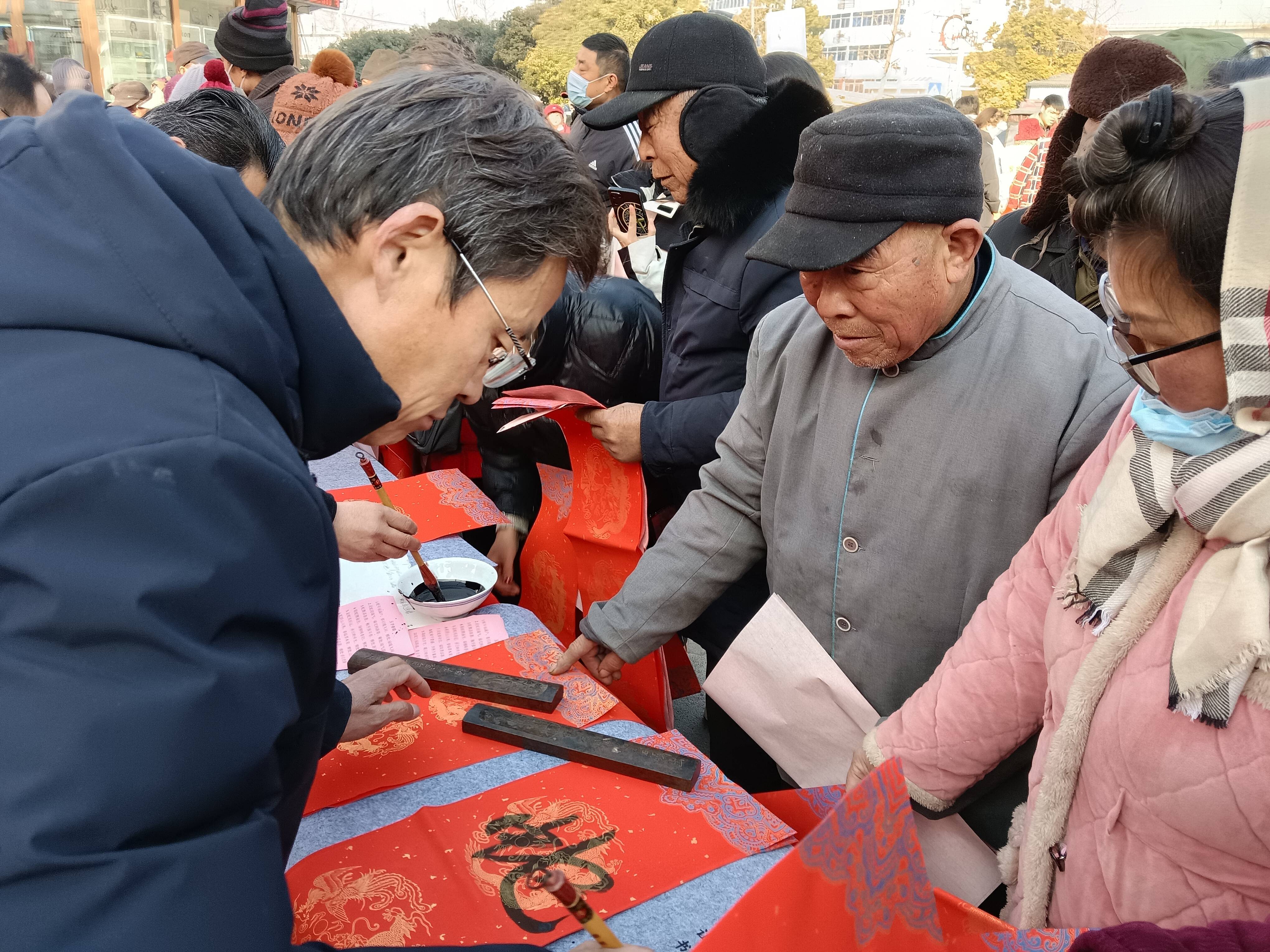 活动现场,暖意融融。大彭中学的党员教师们早早地摆好桌椅,准备好笔墨纸砚。书法老师们个个满怀激情,挥毫泼墨。一幅幅寓意吉祥的春联在他们笔下诞生,“蛇年福满户,春日暖人间”等对仗工整、饱含美好愿景的联语跃然纸上。行书、楷书、隶书等多种字体各显神韵,吸引了众多居民驻足观看。
