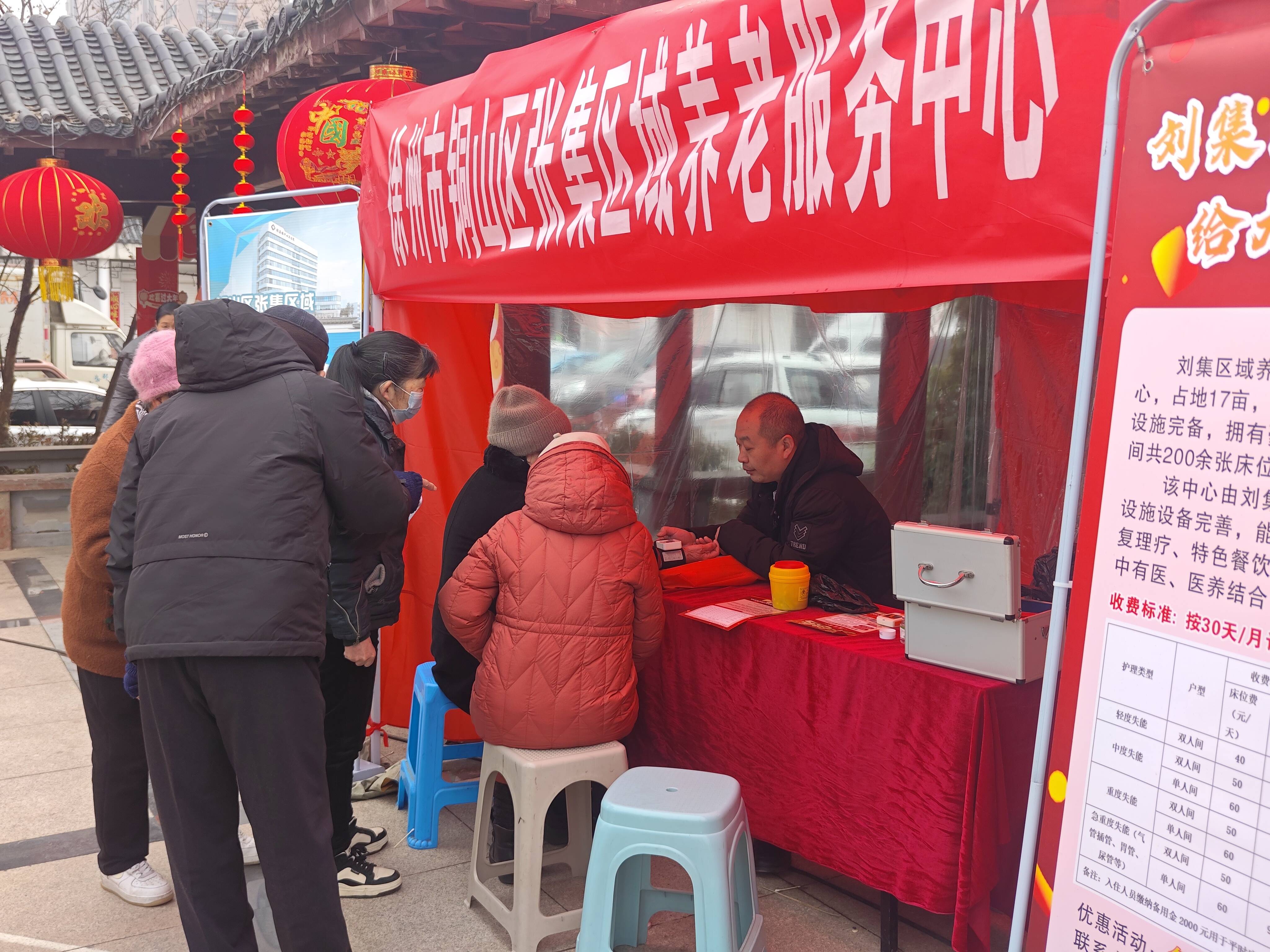春节期间,在铜山新区无名山公园北门广场,开展了张集区域养老服务中心“促消费、惠民生”养老大集宣传活动。此次活动免费测血糖280人,测血压约260人次活动,养老宣传资料发放300多份。通过此次宣传让更多有养老需求的人群了解到,医养结合的必要性。
