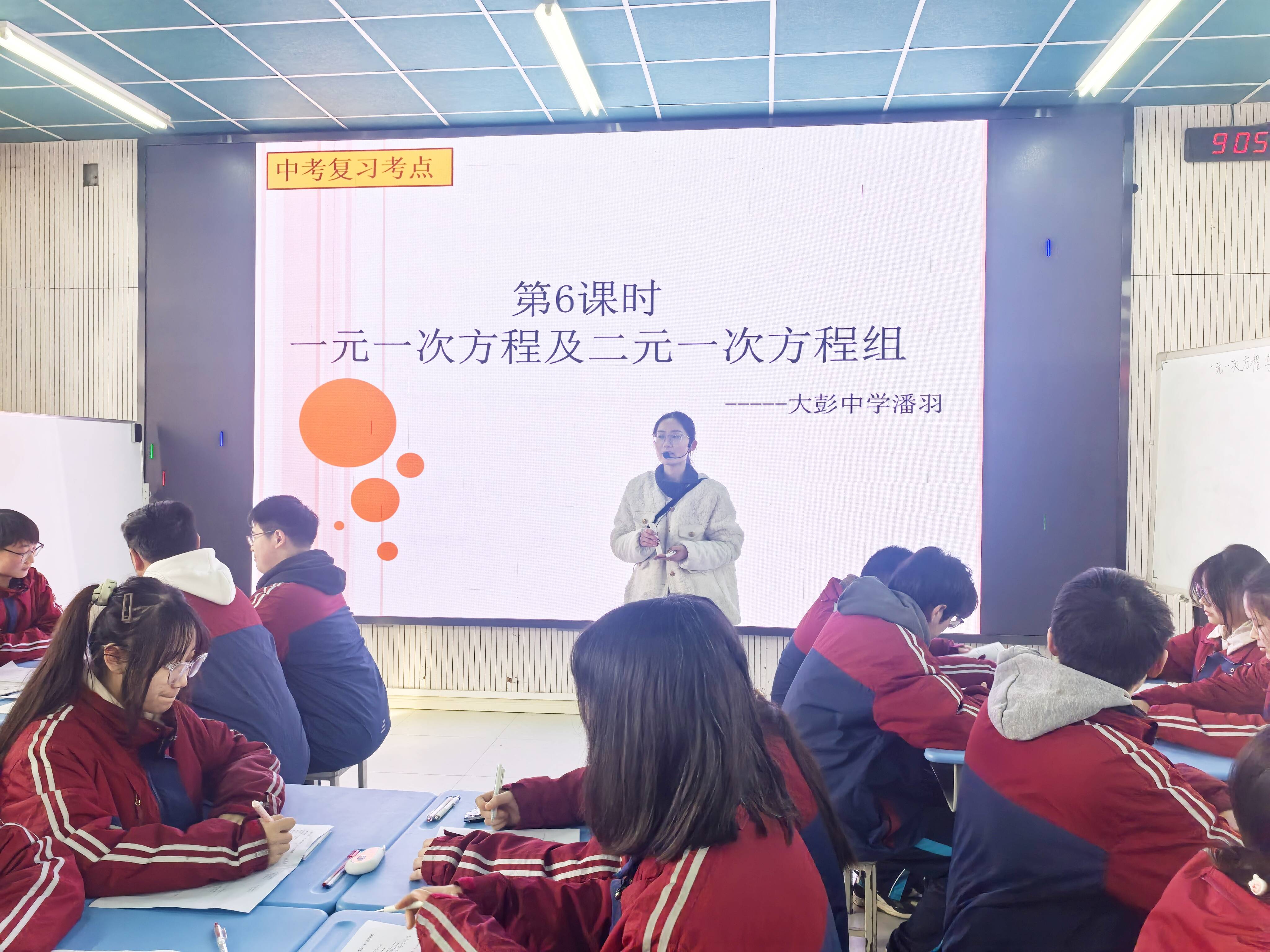 接着由大彭中学潘羽老师执教,潘老师为大家带来《一元一次方程及二元一次方程组》的深度讲解。潘老师凭借对中考命题趋势的精准洞察,一开课便直切重点,围绕中考考点徐徐展开教学。在整个授课过程中,潘老师通过不断地引导学生在真题和例题的练习中巩固知识点,让学生们不仅学会了解题,更掌握了中考相关考点的解题方法。学生们在潘老师的引导下,积极参与课堂,思维得到了充分地锻炼,对一元一次方程及二元一次方程组的知识有了更扎实地掌握。