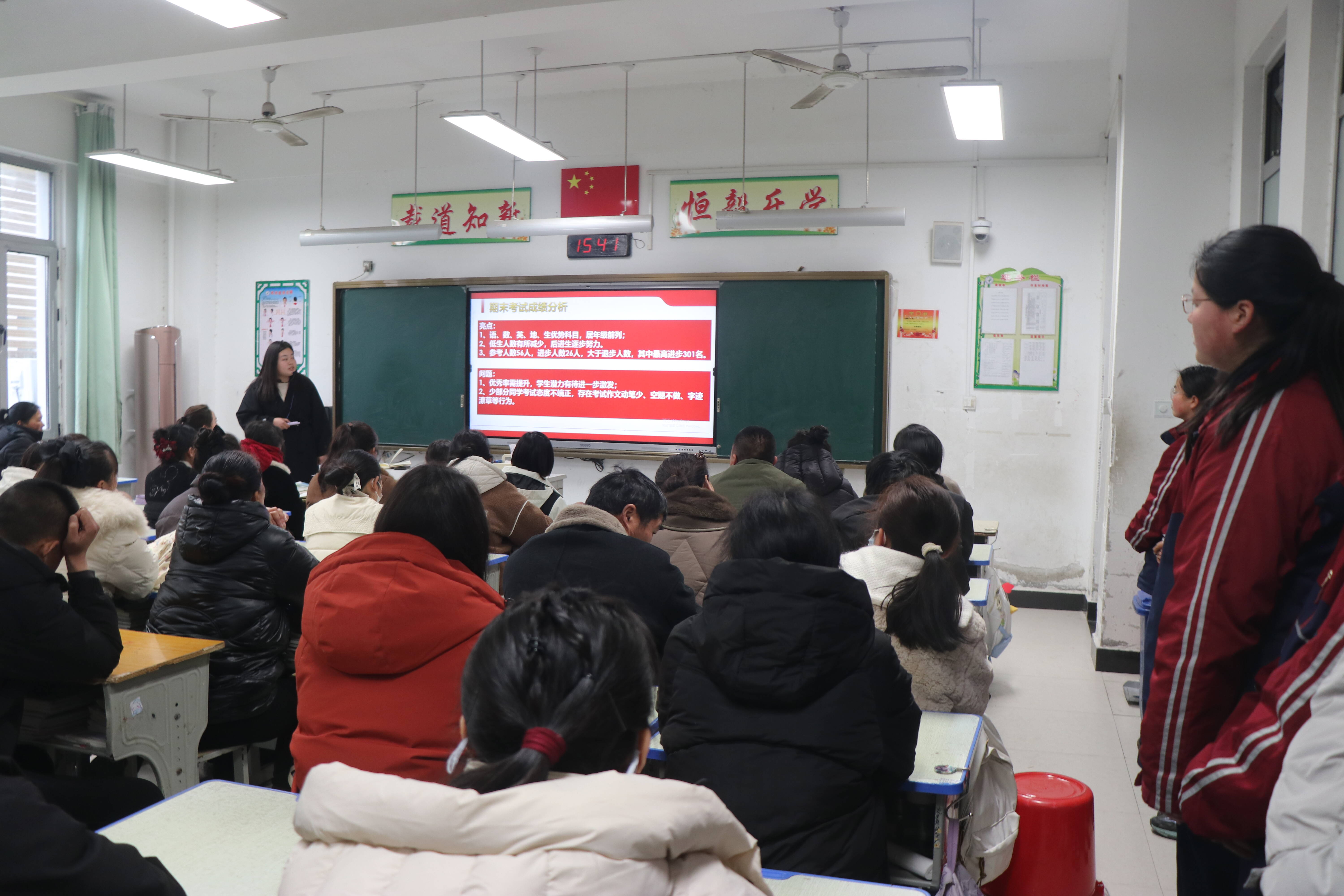 八年级的家长会则重点围绕期末成绩分析、表彰以及地生中考展开。老师针对上学期期末成绩进行了深入剖析,帮助家长全面了解孩子的学习情况。随后,对成绩优异和进步显著的学生进行了表彰,家长和学生一起上台领奖,激励同学们在新学期奋勇争先。面对即将到来的地生中考,老师向家长们介绍了考试的重要性、考试内容以及备考策略,鼓励家长积极配合学校,关注孩子的学习状态,为孩子提供支持和帮助。