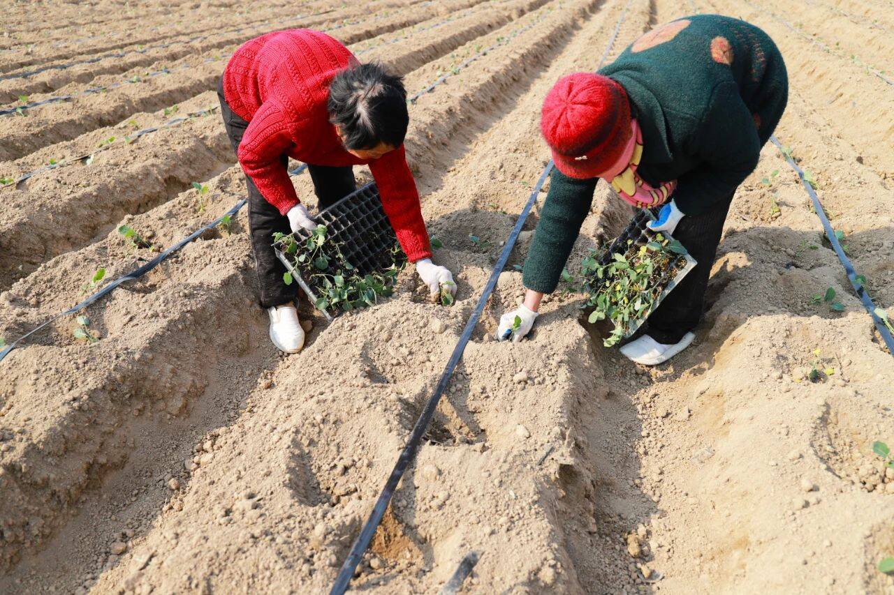 眼下,正值西兰花移栽的关键时节,在马坡镇和畅庄村的一处西兰花田里,村民们正在有条不紊地搬苗、挖坑、移栽、覆上薄膜、填土夯实……一番熟练操作后,一株株西兰花幼苗在空气中绽绿吐翠,在春日暖阳下熠熠生辉,田间地头呈现出一派繁忙的种植景象。