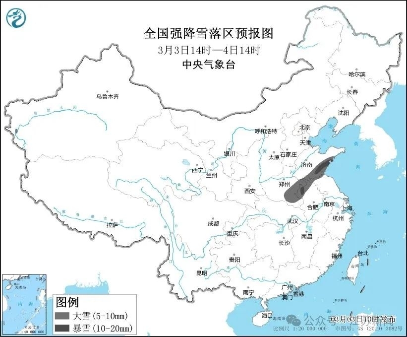预计3月3日14时至3月4日14时,山东南部、河南东部、安徽西北部、江苏北部等地部分地区有大雪,其中,山东南部、安徽西北部等地局部地区有暴雪。上述部分地区新增积雪深度3~6厘米,局地可达8厘米以上。