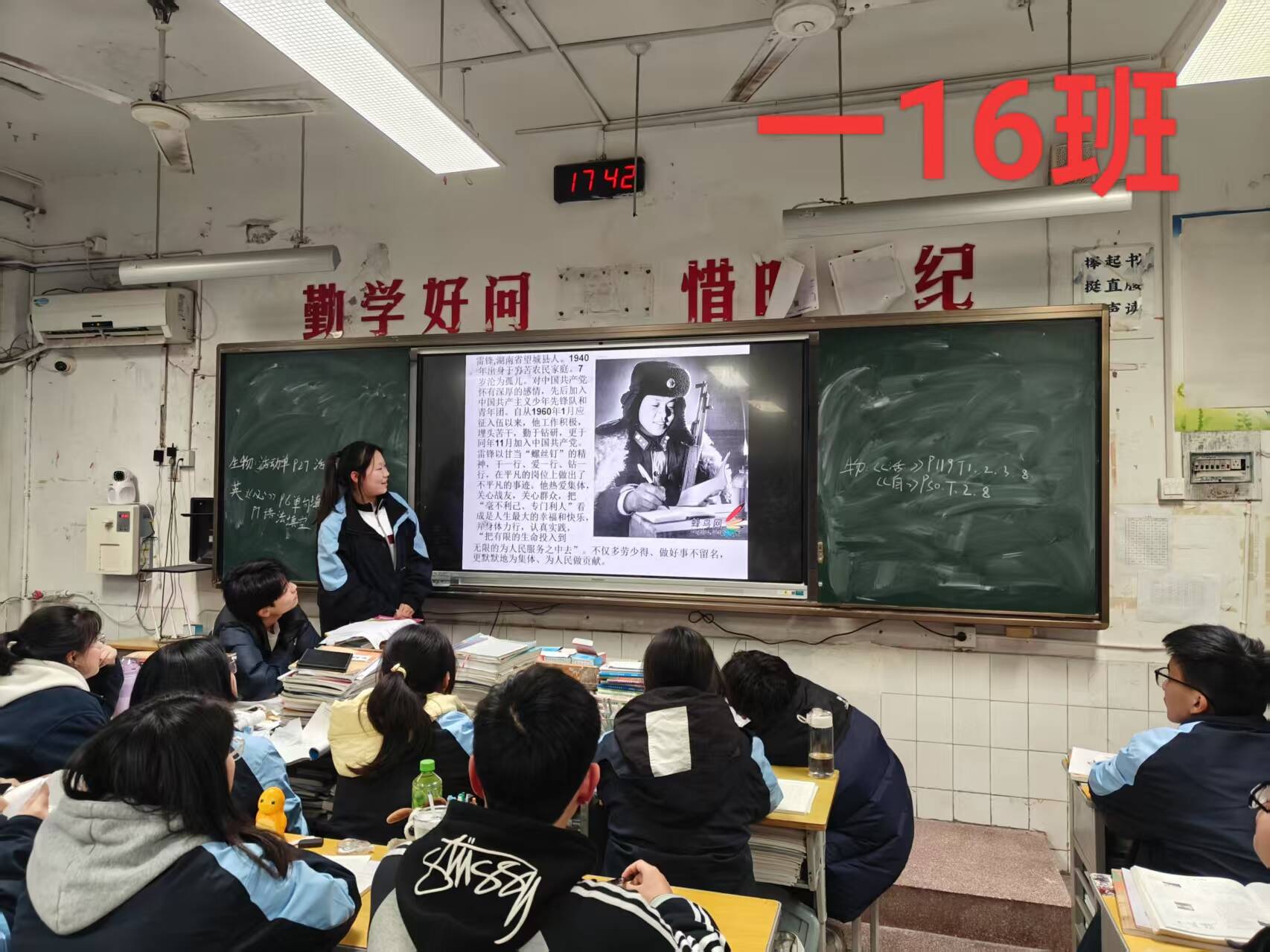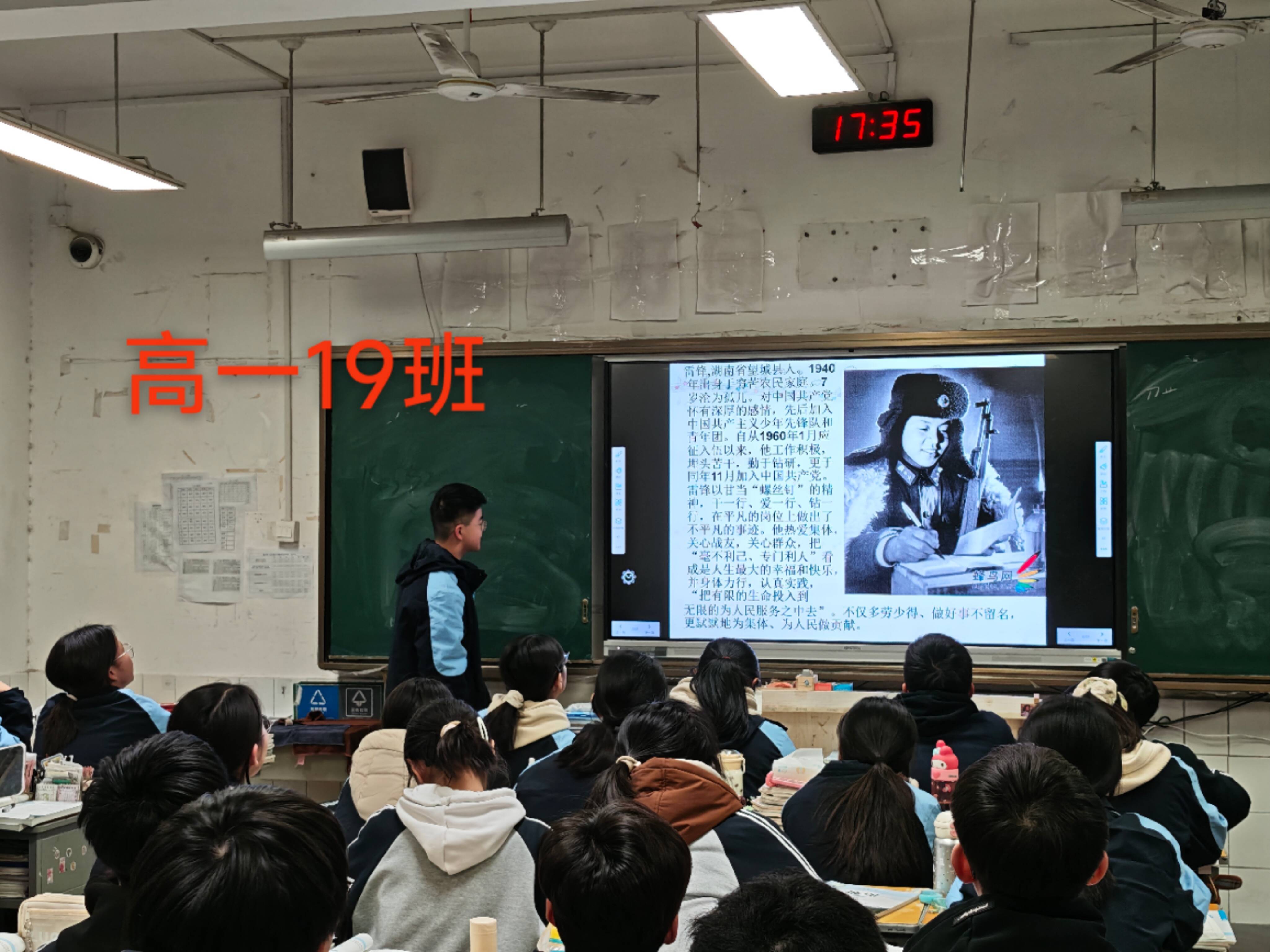 班会在各班级教室热烈展开,班主任们精心准备,通过PPT、视频等多种形式,生动再现了雷锋同志短暂而光辉的一生。从雷锋小时候的苦难经历,到他参军入伍后的无私奉献,再到他因公殉职前的最后一刻,每一个故事都深深触动了学生的心灵。同学们聚精会神地听着,被雷锋那种“对待同志要像春天般的温暖,对待工作要像夏天一样的火热”的精神所感染。