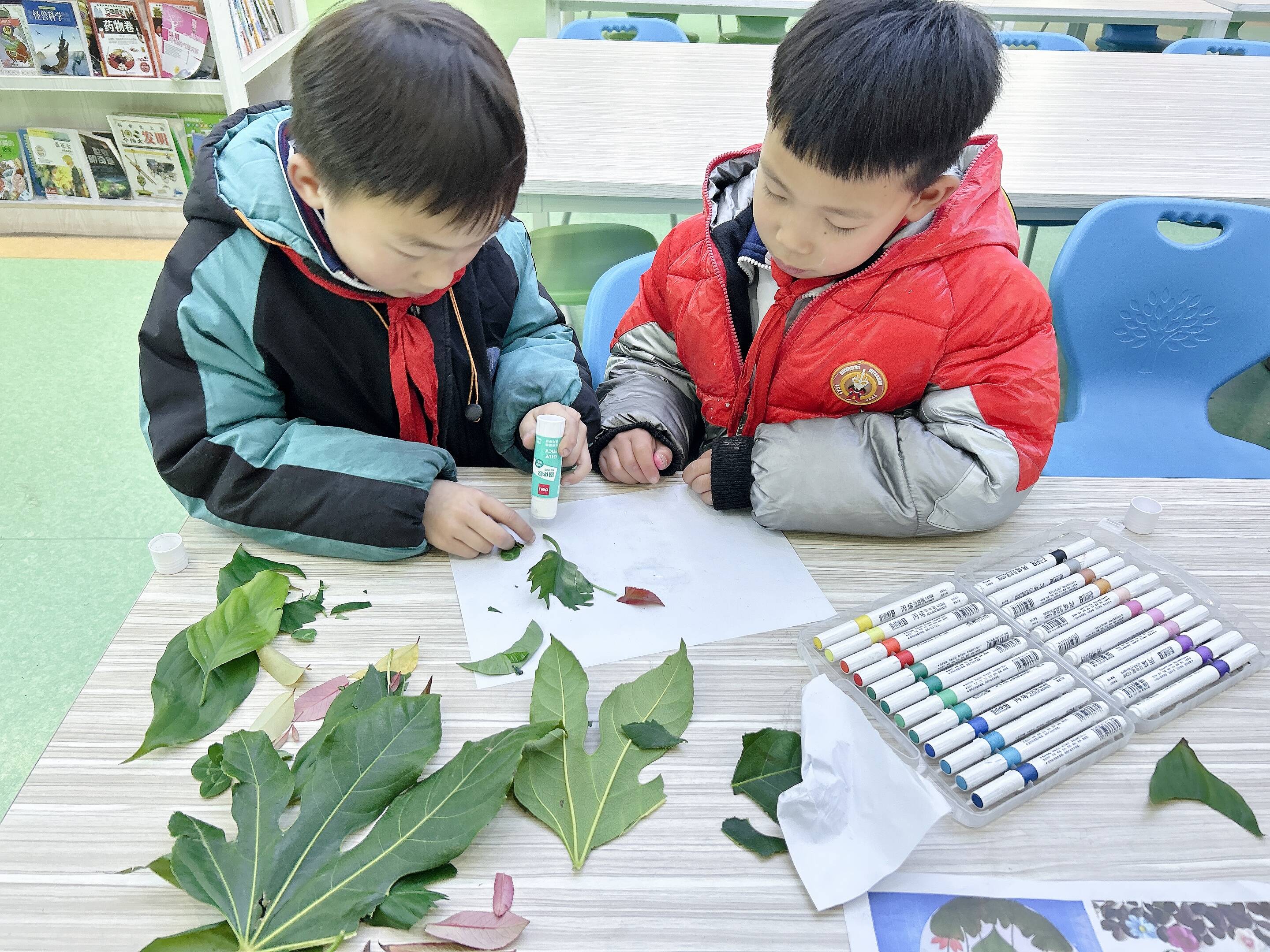 回到教室后,一场创意十足的树叶画制作活动正式开始。同学们充分发挥想象力,将采摘来的树叶拼凑、组合。有的同学用银杏叶拼成翩翩起舞的蝴蝶,有的用枫叶勾勒出火红的夕阳,还有的用柳叶描绘出随风摇曳的柳树。