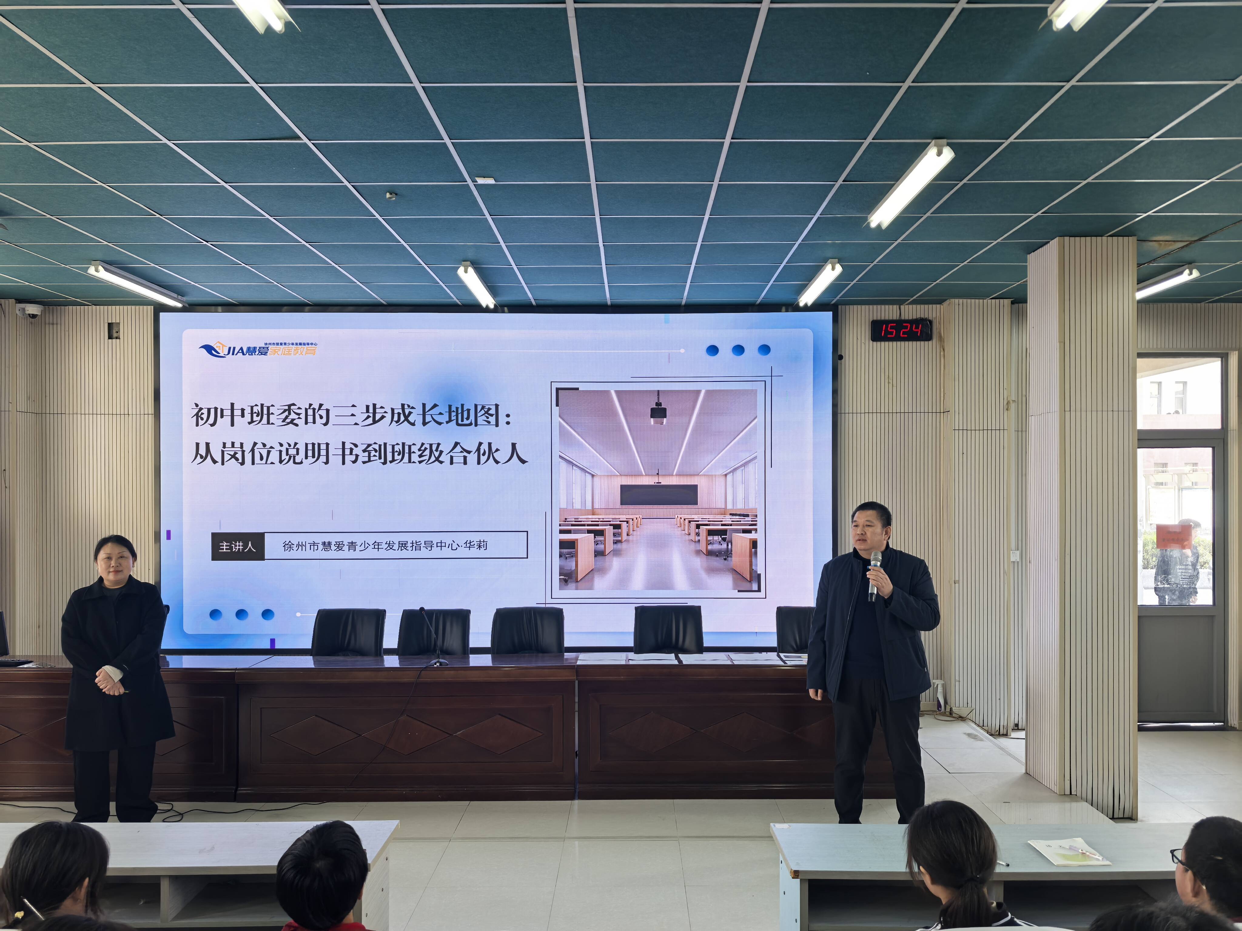 近日,大彭镇中心中学的校园内洋溢着别样的活力,一场别开生面的班会课在此精彩上演。本次活动由学校政教处王强主任精心主持,特别邀请到了来自徐州市慧爱青少年发展中心的华莉老师,为全体班干部带来主题为《初中班委的三步成长地图:从岗位说明书到班级合伙人》的培训。