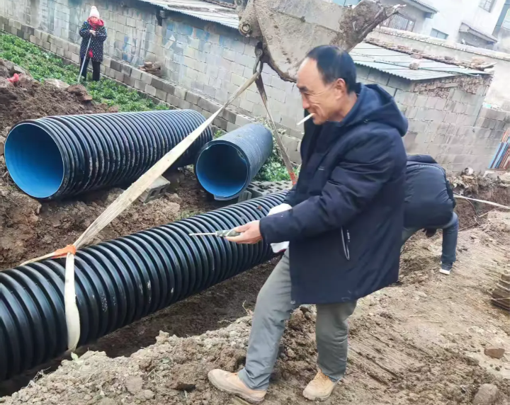 基于详实的勘察结果,村委会投资二万余元,购置直径 60 厘米、长达百米的排水管道。并且集结了一支由管道安装工、泥瓦工、机械操作工等组成的经验丰富、技术精湛的施工队伍。如今,施工有序推进,不久后,这条排水管道将投入使用,有效解决村庄北侧汛期积水难题,切实为群众的出行和生活提供便利,彰显了村委会为民服务的担当与决心。