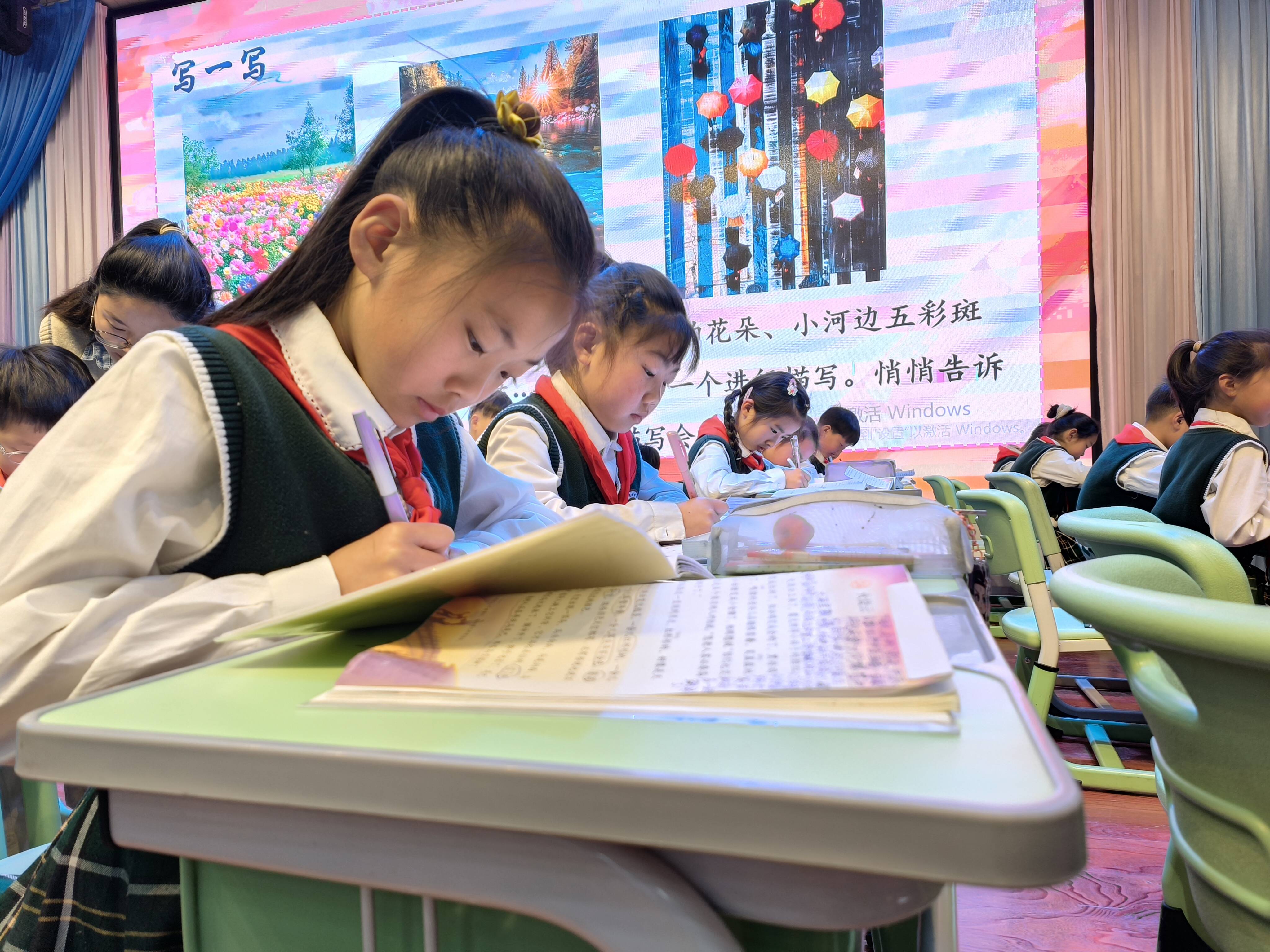 在课堂教学观摩环节,中心小学张倩老师率先登场,为三(4)班的学生带来《火烧云》一课。张老师巧妙引导,通过生动的讲解和丰富的互动,让学生仿佛置身于绚丽多彩的火烧云奇景之中,充分激发了学生的想象力和对语文学习的兴趣。张老师的课,重在引领学生打好根基,贯串整堂课的是不断提升的朗读以至诵读。课堂伊始,以火烧云的图片引入,让学生感受到火烧云颜色变化之多、形状变化之快,体会萧红笔下的诗意美景。通过学习活动,学生能够迁移运用,用各种不同形式的颜色,来表达眼中那五彩斑斓的世界;更是在生活中拥有了一双发现美的眼睛。