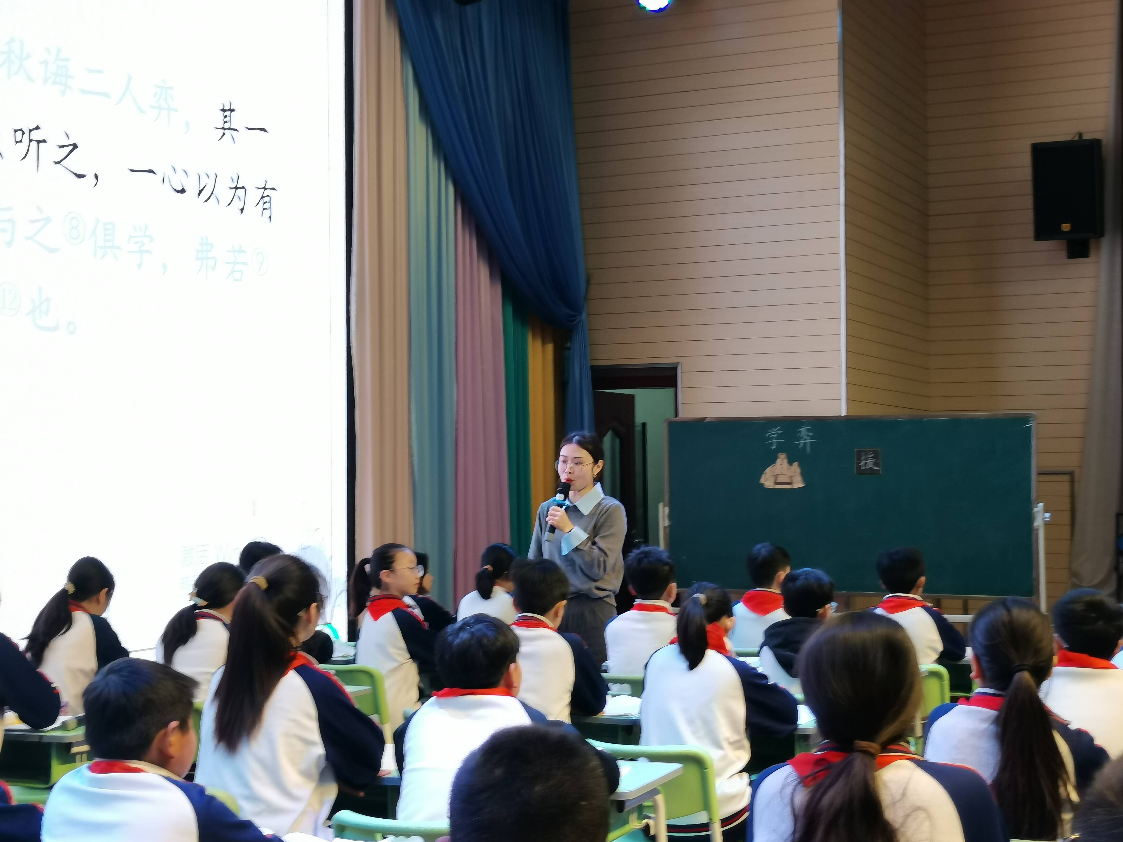 如果说张老师的课是一节低段语文的诗意探索,那么,郝湾小学刘璇老师在六(5)班执教的《学弈》则是充满理性与智慧的高阶思辨。刘老师紧扣文本,以深入浅出的方式引导学生理解文言文的含义,感受古人的智慧,培养了学生的文言文阅读能力。刘老师的课思路清晰,指导有方,层层递进,整堂课行云流水,注重学生的朗读、诵读,学生能当堂诵读经典,甚至学以致用,在生活中也能试着用观点加事实来论证自己的观点。