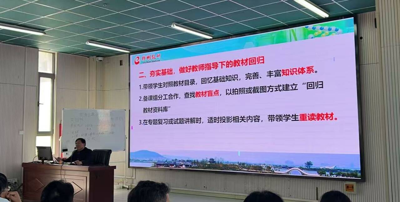 紧接着,教研室李忠元老师开展一检考试要求及复习建议讲座。李老师围绕一检考试的题型特点、命题趋势进行详细解读,从知识梳理、专题训练、答题技巧等多方面给出实用复习建议,为教师们明确了下一阶段教学工作的重点与方向,为提升复习教学的针对性和有效性提供了有力指导。