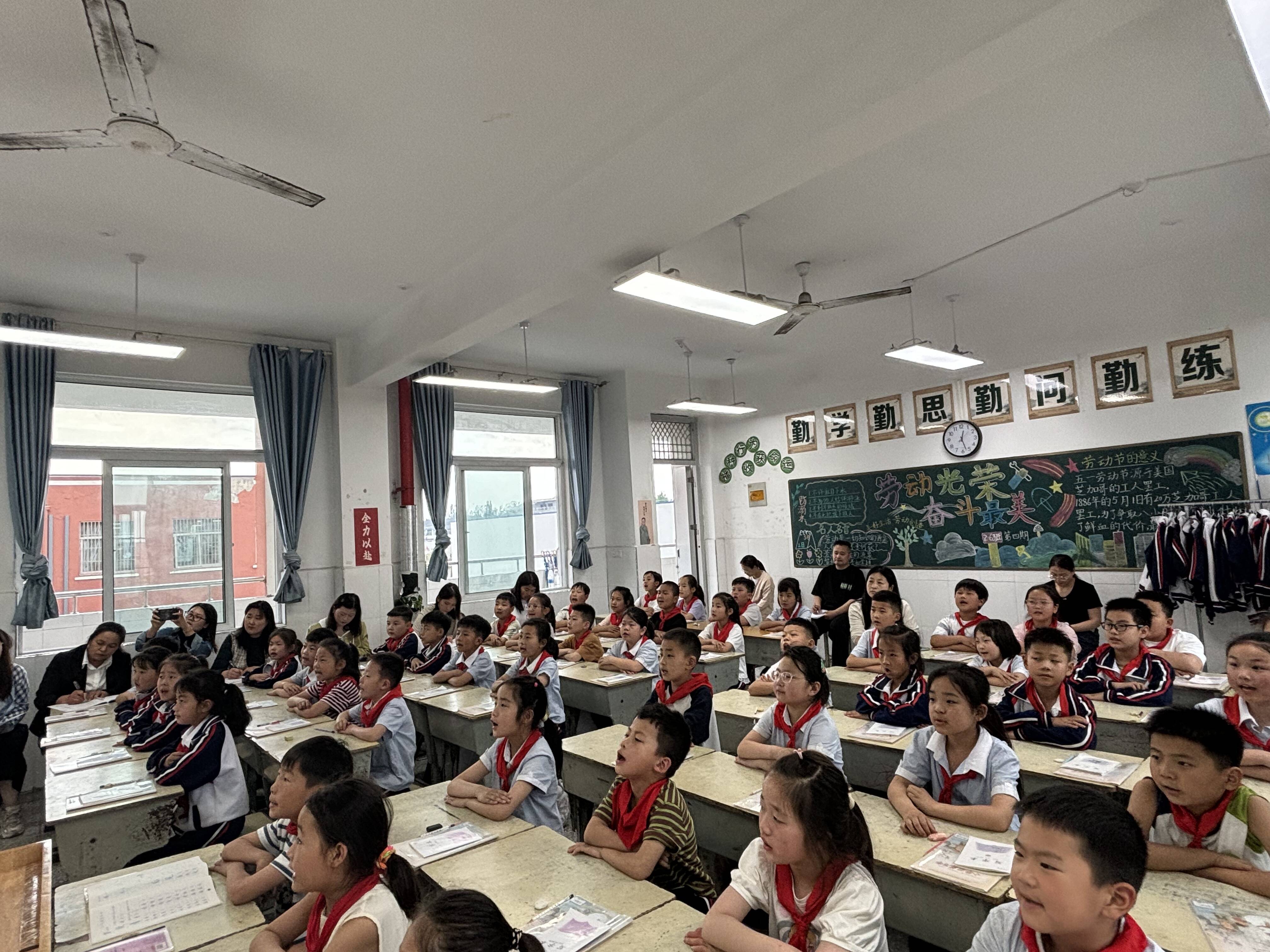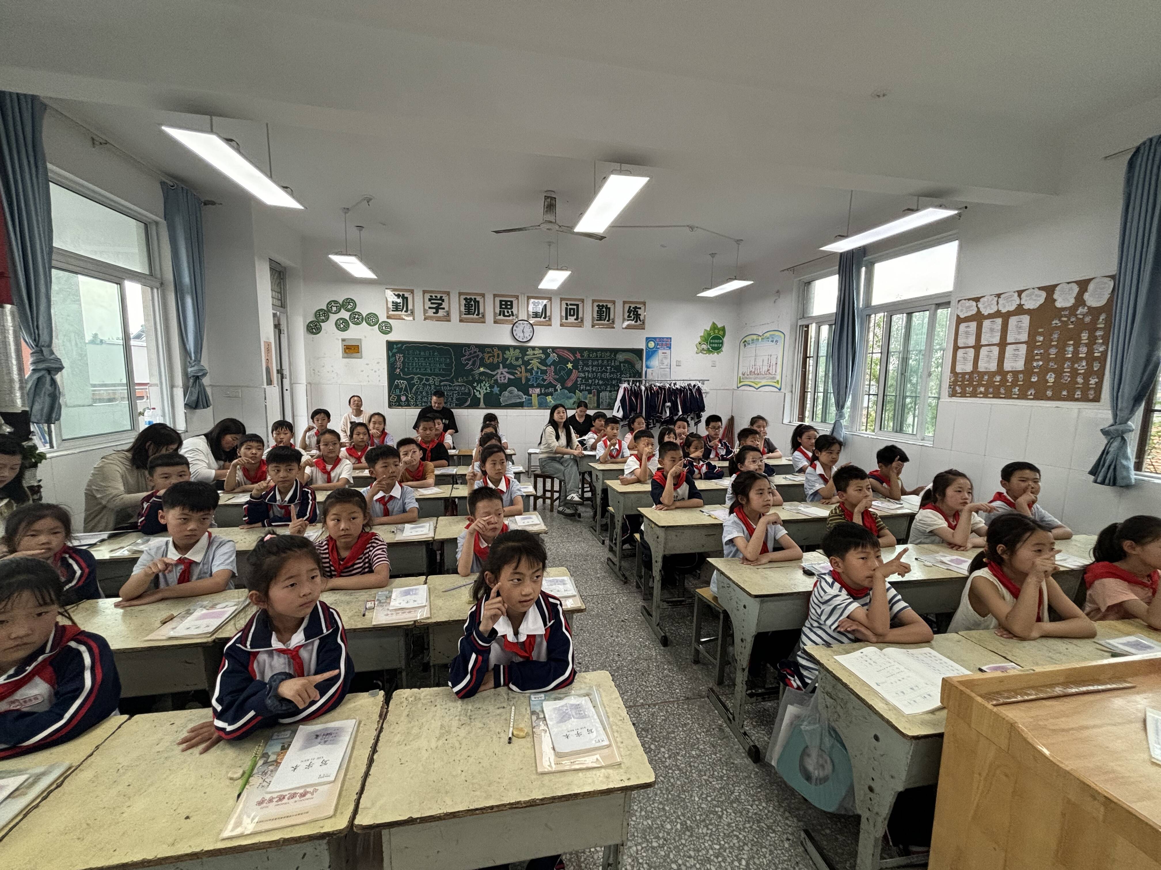 2025年5月14日中午,在铜山区房村镇中心小学二年级6班的教室里,一场充满趣味与文化底蕴的写字课正如火如荼地展开。王佩老师以二年级下册《大象的耳朵》为依托,为孩子们带来了一堂别开生面的写字指导课,引得一二年级语文老师们纷纷前来观摩学习,副校长张道初、教务主任邢燕子、语文教研组长喻孟也参与其中,共同见证这一书写之旅。