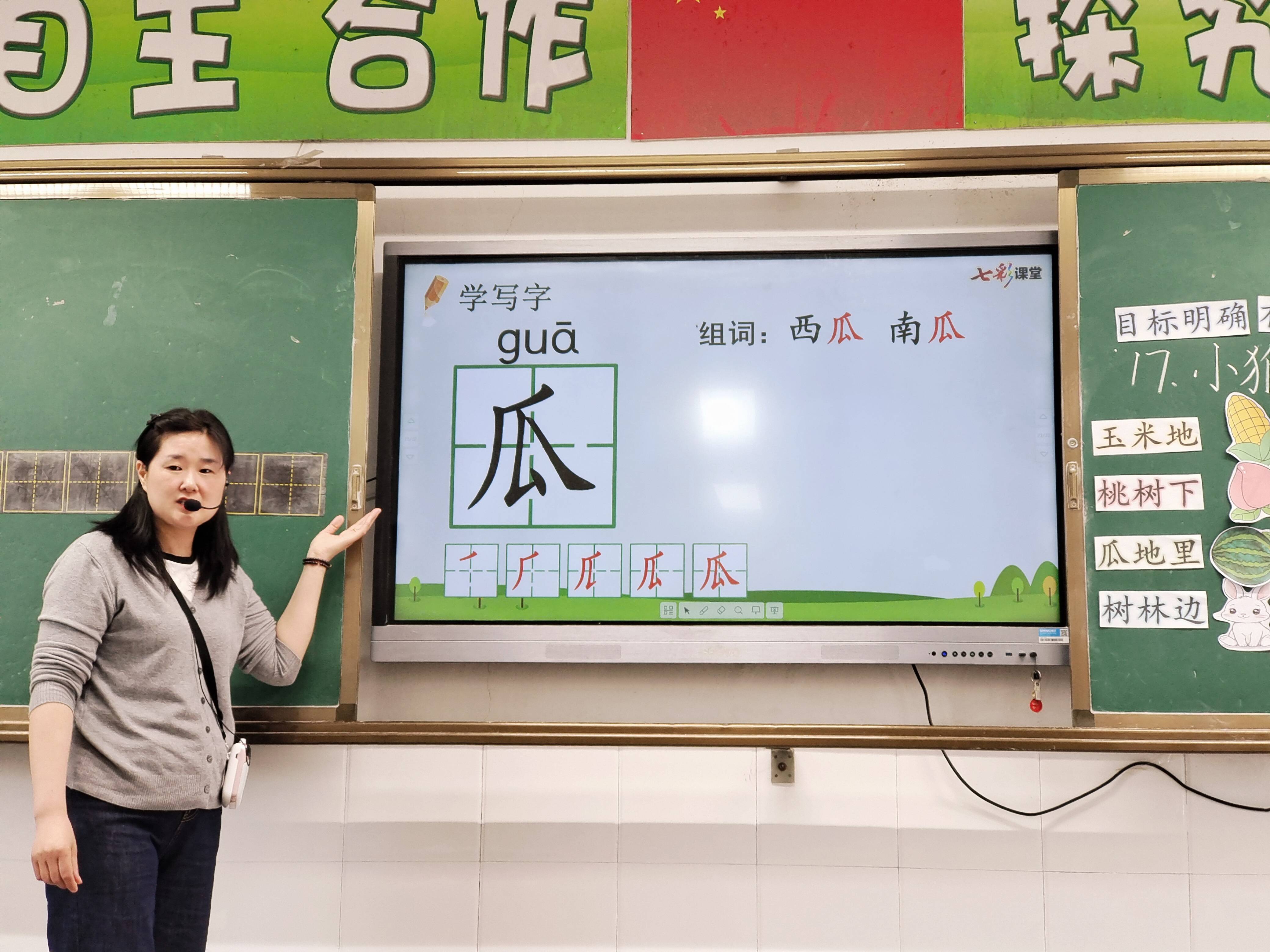 课堂接近尾声,来到识字教学环节。李老师详细讲解“瓜”字,从读音“guā”,到组词“西瓜”“南瓜” ,再到在田字格中一笔一划范写,同学们清晰掌握规范写法。