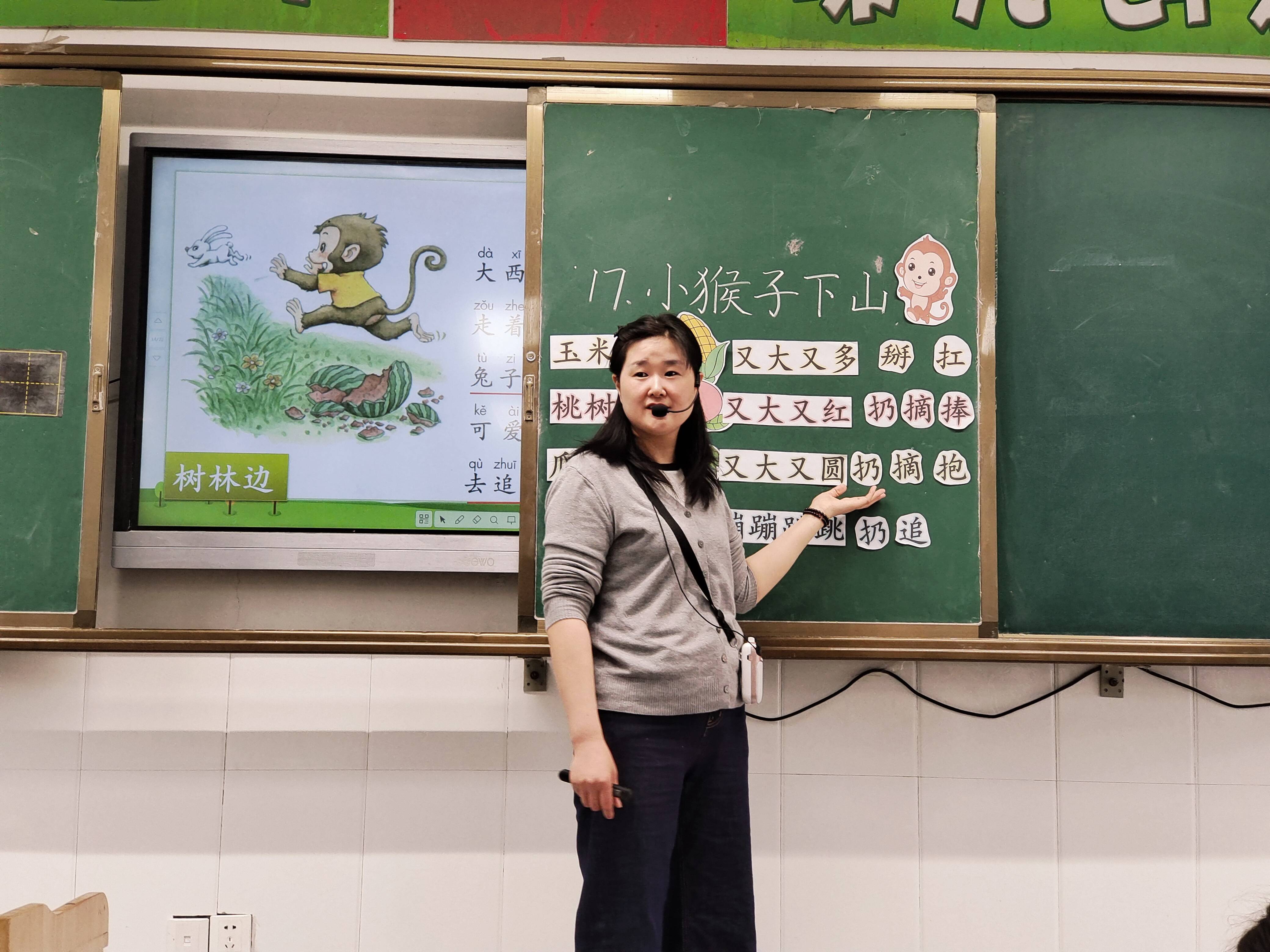 随后,课程进入到课文解读环节。吕巧玲围绕《小猴子下山》的内容,引导学生们进行朗读指导。在分析小猴子的经历时,吕巧玲巧妙提问,让同学们朗读课文,找出小猴子看到和做的事。同学们在吕老师的引导下,清晰梳理出小猴子的行程与行为。通过反复朗读最后一个自然段,同学们深切体会到小猴子失落、后悔的情绪。