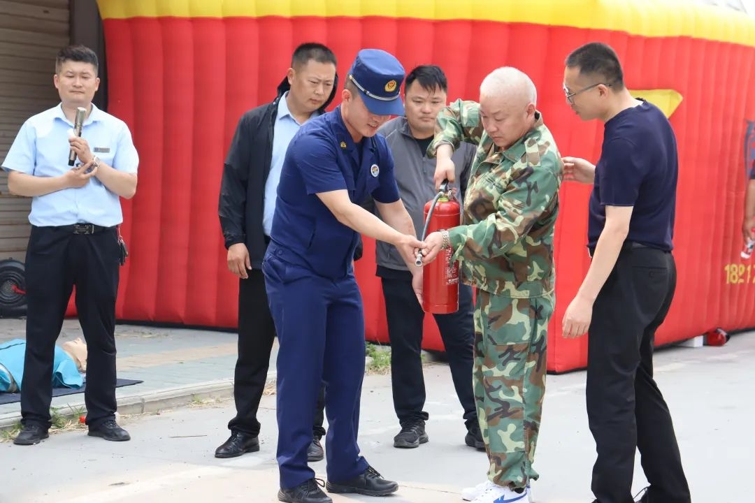 本次活动通过"理论+实操"形式,系统化提升参训人员应急能力。在浓烟疏散演练环节,参演人员在消防员指导下,用湿毛巾掩住口鼻,沿安全通道有序撤离模拟火场,沉浸式体验火场逃生要点;针对不同材质灭火器的使用场景,消防员现场演示干粉、二氧化碳等灭火器的操作技巧,并组织参训人员分组进行油盆灭火实操,确保人人掌握"提、拔、握、压"四步灭火法。活动还特邀专业医护人员开展心肺复苏和AED使用教学,通过人体模型示范胸外按压节奏、人工呼吸方法及AED操作流程,切实增强群众急救互救能力。