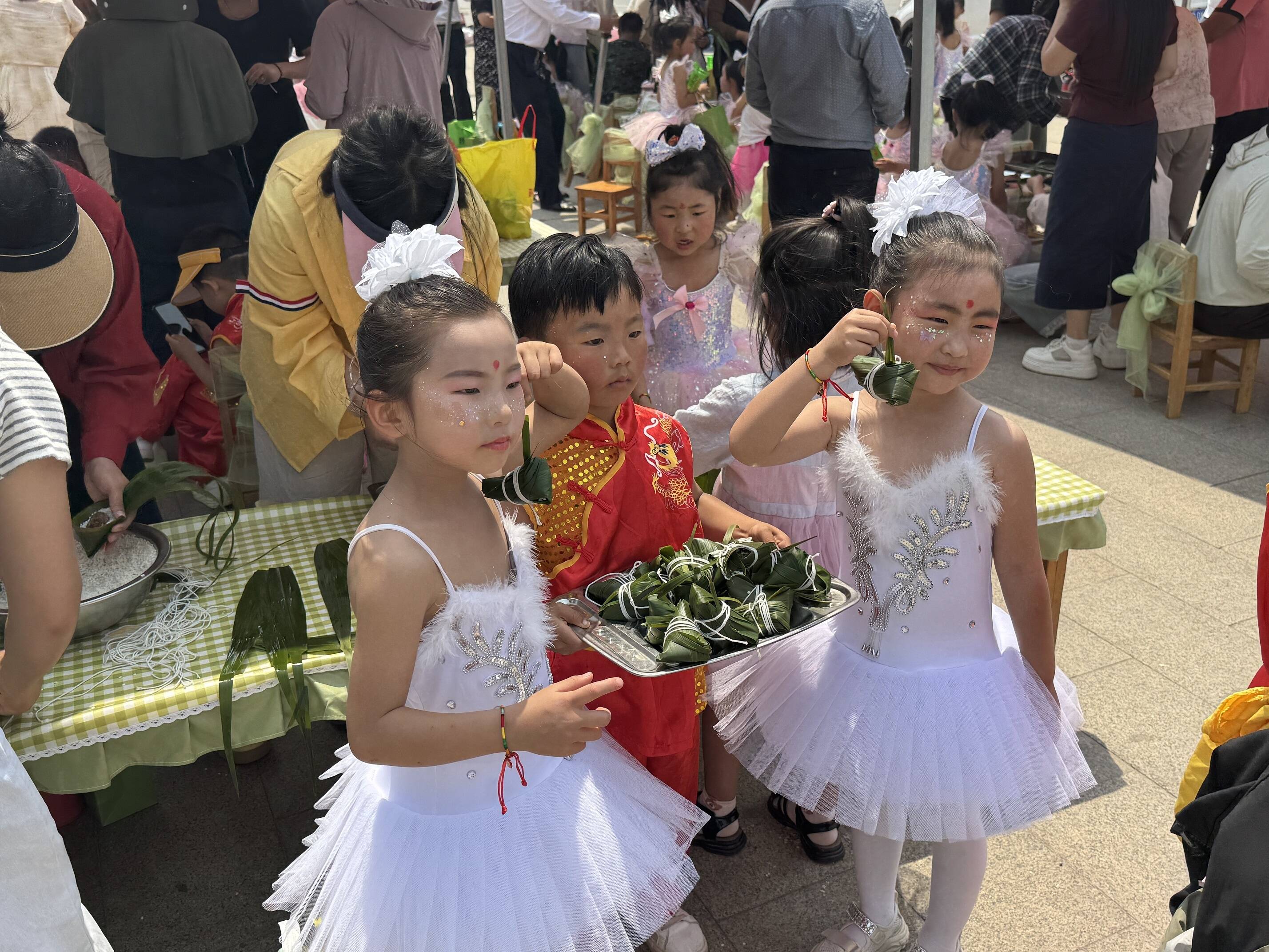 活动当天,幼儿园内洋溢着节日的喜悦。新鲜的箬叶、晶莹的糯米、香甜的蜜枣等材料早已准备就绪。在老师以及来自各部门志愿者的耐心引导和陪伴下,一双双稚嫩的小手开始了探索之旅。孩子们认真观察学习,尝试着卷叶、填米、放馅、捆扎。一个个形态各异、充满童趣的“作品”在孩子们手中诞生,现场欢声笑语不断,粽香与温情弥漫。