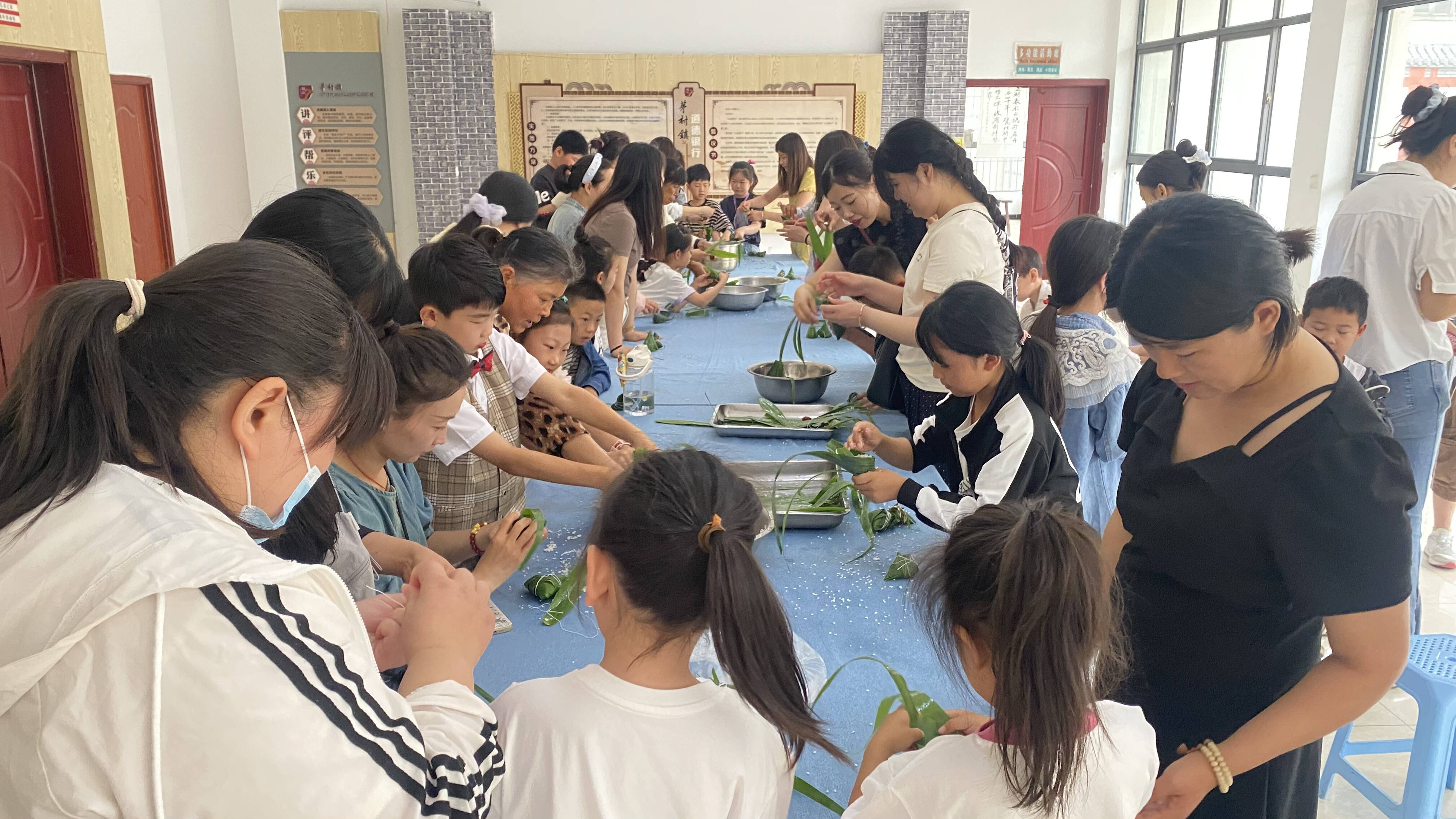 关工委同志首先向大家介绍了端午节的起源、习俗和文化内涵,从屈原投江的悲壮传说,到挂艾草、佩香囊、赛龙舟的民间传统,让同学家长对这一传统节日有了更全面、更深刻的认识。接着蜗牛培训学校老师现场演示了粽子的制作步骤,来自茅村镇蜗牛口才培训学校的70名学生和家长共同参与这次活动。