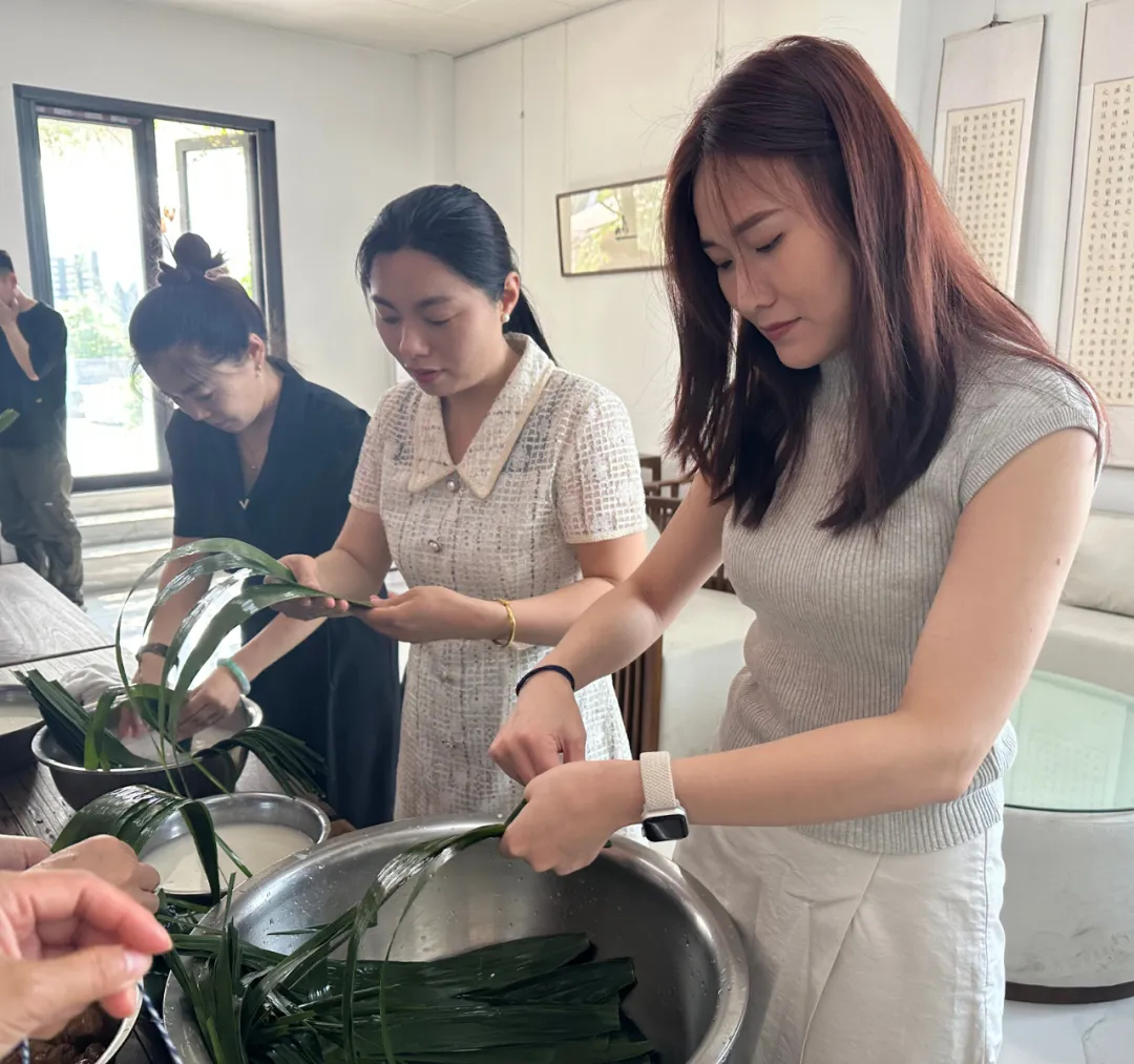 最热闹的当属包粽子区域,折叶、填米、塞枣、缠线……在孔祥丽老师的悉心指导下,参与者们手法逐渐娴熟,不一会儿,一个个棱角分明的粽子就摆满了桌面,现场欢声笑语不断,空气中弥漫着粽叶的清香。